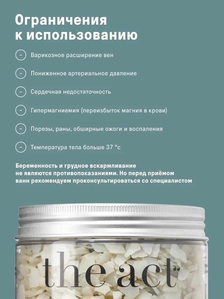 Как действует: магниевая соль The Act оказывает мощный расслабляющий эффект, восполняет недостаток минералов и микроэлементов, выводит токсины, улучшает кровообращение и борется с воспалениями. Нормализует сон: вы начнете легко засыпать, избавитесь от тревожных сновидений и будете просыпаться утром отдохнувшими и бодрыми. Теплая ванна с солью снимает спазмы и боль в мышцах, шее и спине после физических нагрузок и занятий спортом.