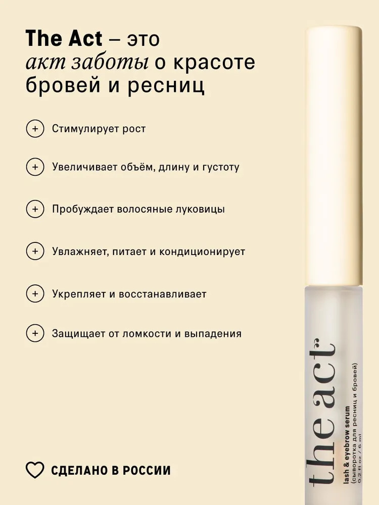 The Act Сыворотка для ресниц и бровейВ данный момент этот товар отсутствует в продаже. Возможно, у нас найдется аналогичный или похожий товар здесь. Секрет естественной красоты ваших бровей и ресниц! Ежедневно под воздействием макияжа и факторов внешней среды брови и ресницы истончаются и теряют прежнюю густоту. Сыворотка для бровей и ресниц The Act c пептидным комплексом и аминокислотами придаёт ресницам длину и естественный объём, активируя рост и укрепляя каждый волосок. |