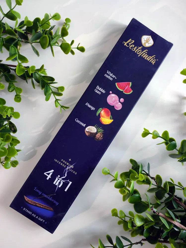 Bestofindia Палочки ароматические с подставкой Premium Incense Sticks 4 в 1 «Watermelon, Bubble Gum, Mango, Coconut»