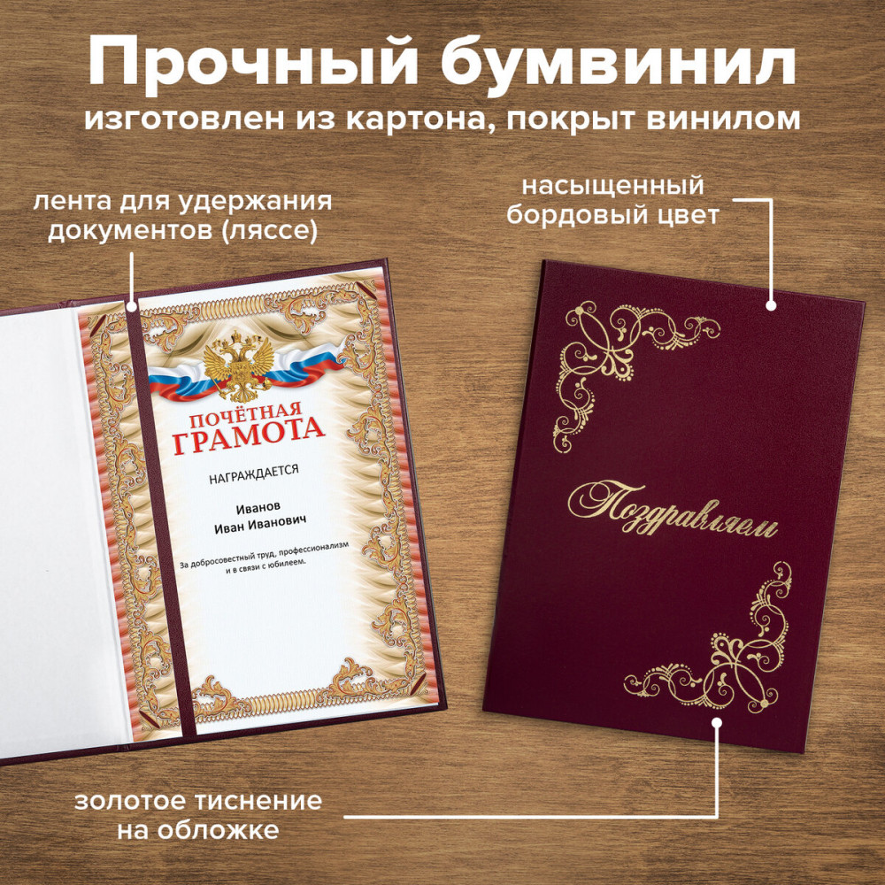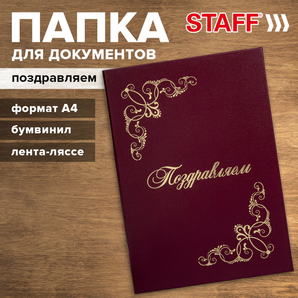 💳 Оплатить за товар можно при получении 🇰🇿 Есть бесплатная доставка по Казахстану от 1 дня 🎁 Копите бонусы с каждой покупки Адресная папка Staff используется для поздравления, вручения наград и дипломов и т.д. Изготовлена из прочного картона, покрытого бумвинилом. Папка для поздравлений формата А4 выполнена в насыщенном бордовом цвете. На обложке — орнамент и надпись «Поздравляем!», нанесенные с помощью золотого тиснения. Снабжена лентой для удержания документов (ляссе). Предусмотрено нанесение логотипа. |