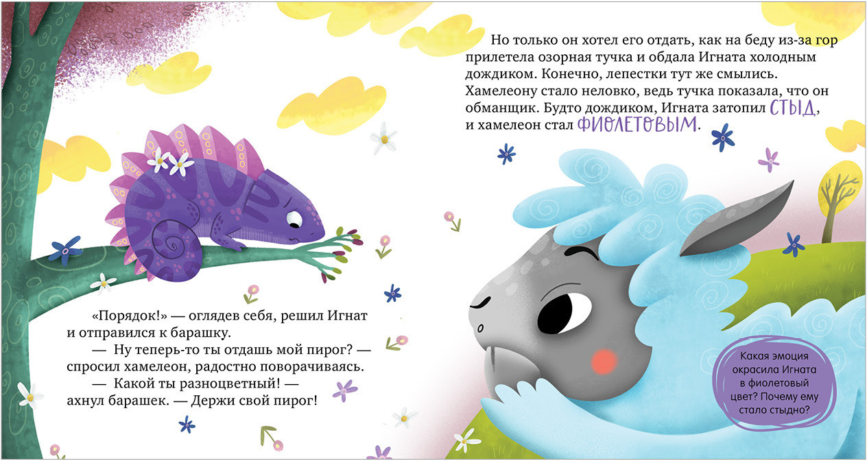 Малыш Игнат был разноцветным. Он познакомился с барашком и попросил его посторожить малиновый пирог бабушки, пока сам Игнат отойдет к ручью попить. Но хамелеон разозлился и стал красным, барашек не узнал его и не отдал пирог. Тогда Игнат обиделся и стал оранжевым... А потом загрустил и стал синим... Как же ему снова стать разноцветным, чтобы барашек его узнал? Нужно успокоиться! Хорошо, что мама Игната подсказала, как справиться с чувствами.
