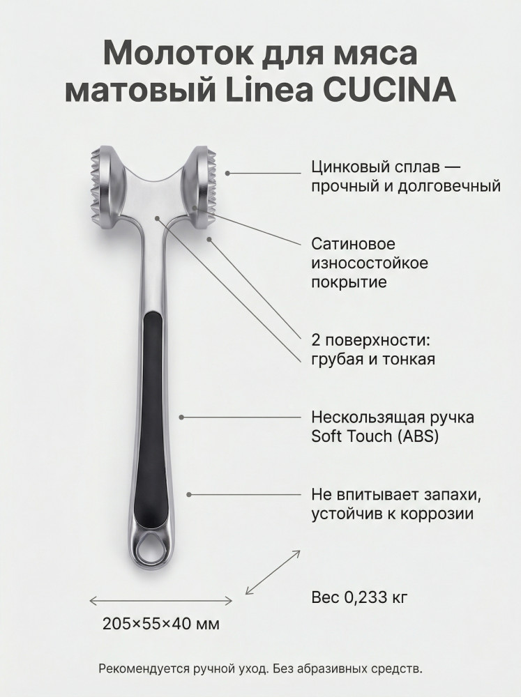 💳 Оплатить за товар можно при получении 🇰🇿 Есть бесплатная доставка по Казахстану от 1 дня 🎁 Копите бонусы с каждой покупки Серия: Cucina Молоток поможет без труда отбить мясо, сделать его более мягким, сочным и вкусным при приготовлении. Материал изготовления: высококачественный цинковый сплав с износостойким светлым никелированным покрытием. Долговечный, прочный , устойчивый к коррозии. Не впитывает запахи. Удобная нескользящая ручка с пластиковой вставкой, с покрытием Soft Touch. Две рабочие поверхности для грубой и тонкой обработки мясных волокон. Практичность и простота в эксплуатации, легкость в уходе. Рекомендуется ручной уход. Не используйте при мытье абразивные чистящие средства. |