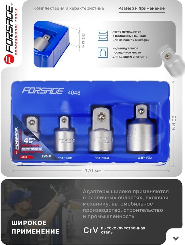 Производитель «Forsage» позиционируется как надежный инструмент для полупрофессионального и любительского ремонта автомобиля и различной техники с привлекательным соотношением цена/качество. Изначально бренд «Forsage» планировалось вывести только на рынок Беларуси, но бренд оказался востребован в странах СНГ и России. Производитель «Форсаж» выдерживает грань между дорогостоящим инструментом с высокими требованиями к качеству, и инструментом, не дорогим, но не надежным. В результате получился...