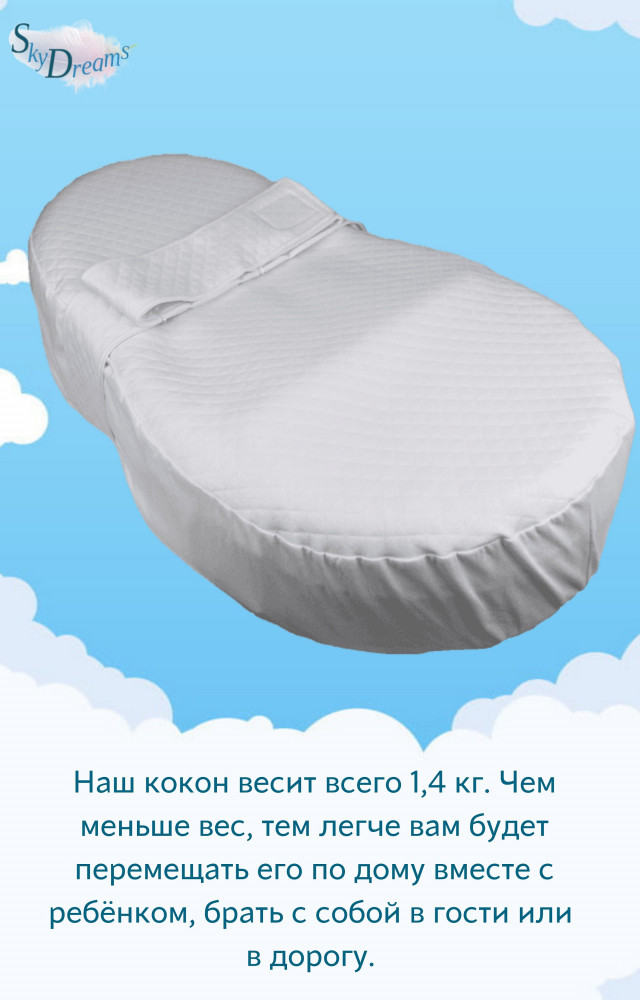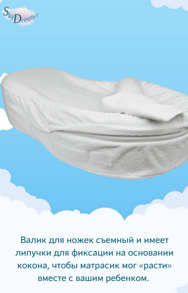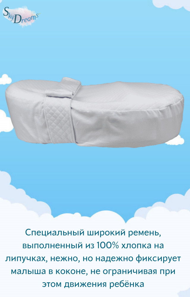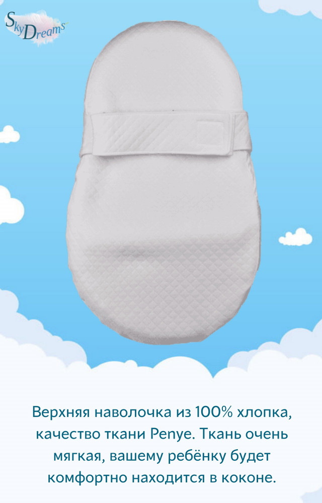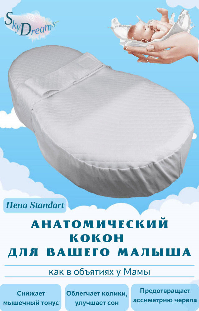 В данный момент этот товар отсутствует в продаже. Возможно, у нас найдется аналогичный или похожий товар здесь. Кокон для новорожденных SkyDreams — эргономический матрасик для новорожденного, имеющий анатомическую форму, которая повторяет очертания тела малыша.