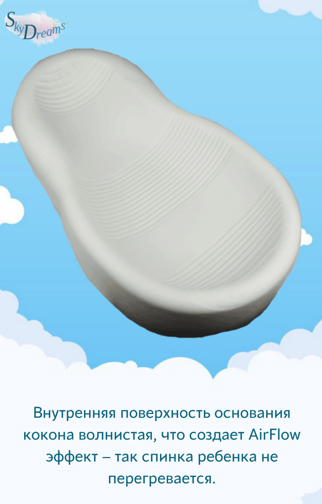 Внутренняя поверхность основания коконов волнистая, что создает AirFlow эффект — так спинка ребенка не перегревается.