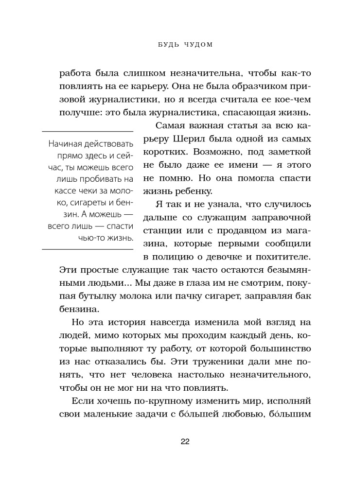 Я не пожалела, что купила её. Очень приятно держать в руках такое издание, это во-первых. А во-вторых - вдохновляет. Я пока только половину книги прочитала, невозможного пока не сделала. Во всяком случае, теперь я замечаю положительное в мире больше, чем раньше.