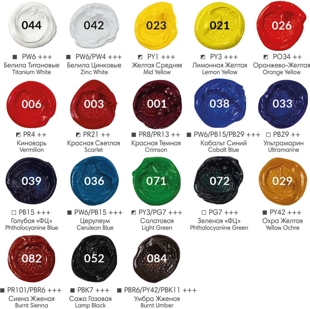Краска имеет 5 степеней затирки пигмента. Вязкая текстура краски обеспечивает сохранение ее эластичности в течение длительного времени. Все краски легко смешиваются между собой. Объем тубы — 12 мл.