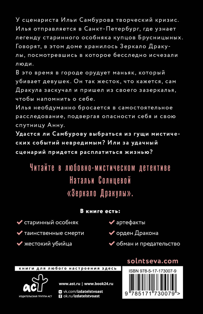 Серия: Все совпаденья не случайны. Романы Натальи Солнцевой У сценариста Ильи Самбурова творческий кризис. Илья отправляется в Санкт-Петербург, где узнает легенду старинного особняка купцов Брусницыных. Говорят, в этом доме хранилось Зеркало Дракулы, посмотревшись в которое бесследно исчезали люди. |