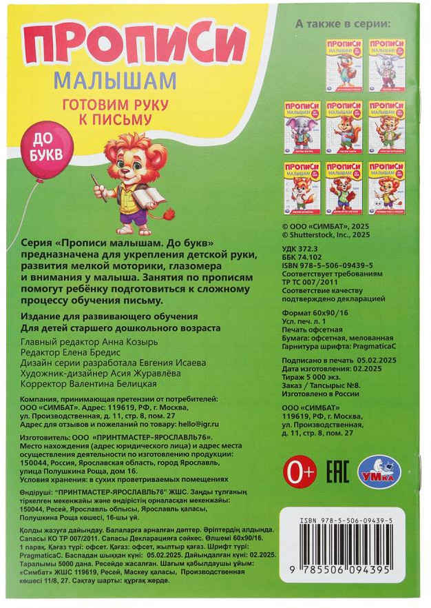 💳 Оплатить за товар можно при получении 🇰🇿 Есть бесплатная доставка по Казахстану от 1 дня 🎁 Копите бонусы с каждой покупки Серия: Прописи малышам Прописи «Готовим руку к письму» из серии «Прописи малышам. До букв» ТМ «УМка» поможет ребёнку потренировать руку к письму: |