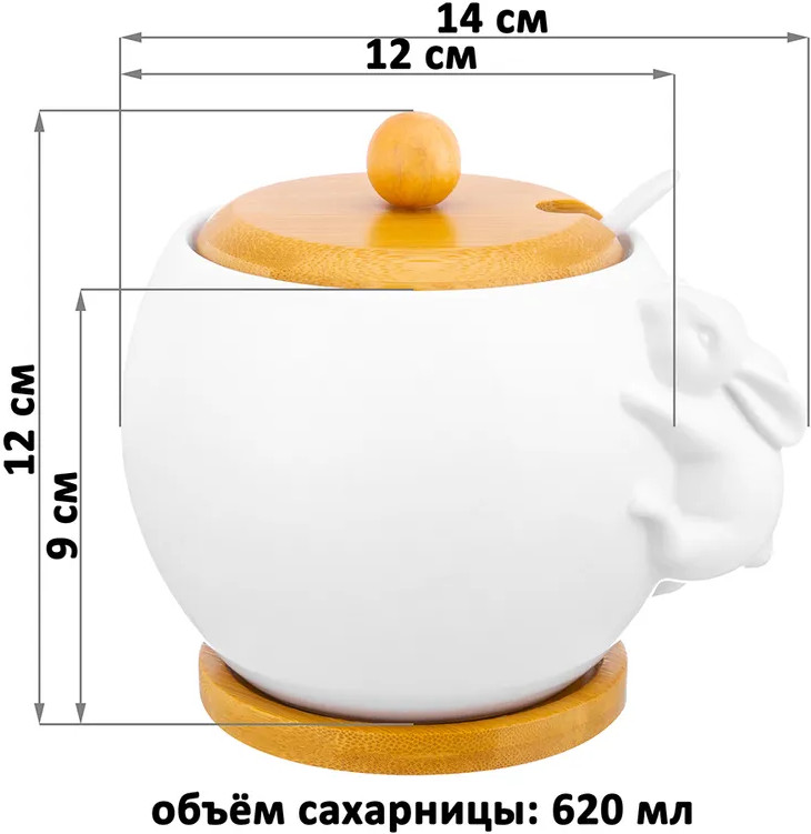 💳 Оплатить за товар можно при получении 🇰🇿 Есть бесплатная доставка по Казахстану от 1 дня 🎁 Копите бонусы с каждой покупки Серия: Кролик Набор 2 круглых сахарниц «Кролик» с ложкой на деревянной подставке предназначен для хранения самых разных продуктов. Размер каждой ёмкости — 12×12×12 см, объём — 620 мл. Сахарницы и ложки выполнены из белого фарфора, крышки и подставки — из натурального бамбука. Каждая сахарница украшена декоративной фигуркой зайчика. |