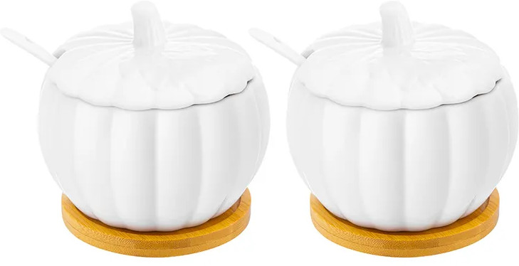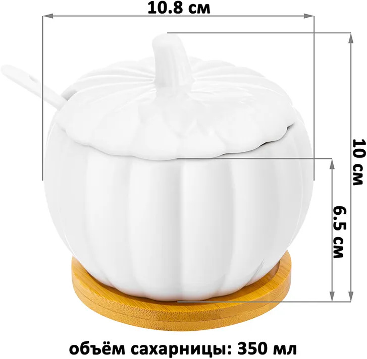💳 Оплатить за товар можно при получении 🇰🇿 Есть бесплатная доставка по Казахстану от 1 дня 🎁 Копите бонусы с каждой покупки Серия: Тыква Набор 2 круглых сахарниц «Тыква» с ложкой на подставке подойдёт для хранения самых разных продуктов. Сахарницы и ложки выполнены из белого фарфора, подставки — из натурального бамбука. Размер каждой ёмкости — 10.8×10.8×6.5 см, объём — 350 мл. Каждая сахарница украшена рельефным узором, повторяющим тыквенные дольки. Благодаря изящному дизайну они прекрасно подойдут для сервировки стола. В них можно хранить сахар, мёд или варенье. |