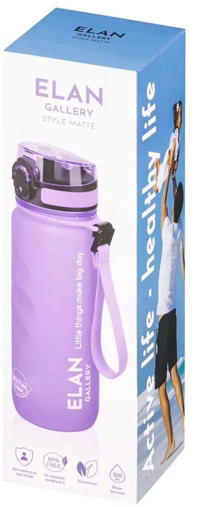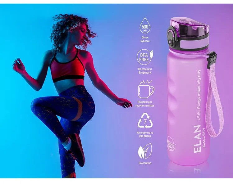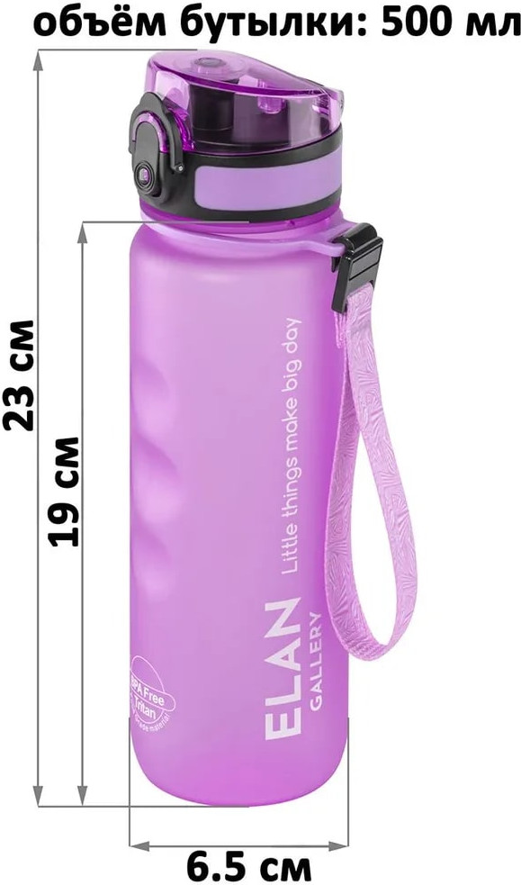 Бутылка для воды и другой жидкости 6,5×6,5×23 см Elan Gallery «Style Matte» со стильным градиентом имеет мерную шкалу с отметками по объему. Следите за водным балансом и ведите здоровый и активный образ жизни! Объём ёмкости — 500 мл, высота до крышки 19 см. Питьевая бутылочка выполнена из качественного пластика Usa Tritan. Материал не содержит бисфенол А, не выделяет вредных веществ, не имеет запаха. Подходит для холодных и горячих напитков: воды, сока или чая. На поверхности имеет углубления для пальцев, что обеспечивает удобный захват и предотвращает выскальзывание из рук даже во время бега. Бутыль для питья оснащена ситечком, поильником и клапаном (замком) на крышке. Дорожная бутылка имеет защиту от случайного открывания в сумке или рюкзаке. Ремешок для подвешивания съёмный: отсоедините черное крепление в виде крючка от бирюзового кольца. Стильный инвентарь станет незаменимой вещью на отдыхе, в путешествиях или спортзале. Бутылку на ремне с матовым покрытием удобно использовать во время поездок на велосипеде, в автомобиле или во время игры в футбол. Фляга для воды Style matte многоразовая, прочная и легкая, её удобно брать в дорогу или тренажёрный зал. Можно использовать как спорт бутылку для фитнеса и велоспорта, туризма, а также как детскую для школьника на занятиях физкультурой. Не впитывает запахи, не влияет на вкус напитков и легко отмывается. Красивая пластиковая бутылка поможет утолить жажду охлаждённым лимонадом на прогулке, тренировке или в школе. Не подходит для СВЧ, ПММ, стерилизатора. Станет приятным подарком мужчинам и женщинам. Такой сюрприз особенно придётся по вкусу спортсменам: футболисту или любительнице гимнастики и танцев. Станет прекрасным дополнением вашей коллекции походного и туристического инвентаря. В коллекции Elan Gallery представлено много посуды и товаров для дома на любой вкус. Спортивные аксессуары серии Style matte помогут следить за водным балансом и пить любимые напитки, где бы вы не находились.
