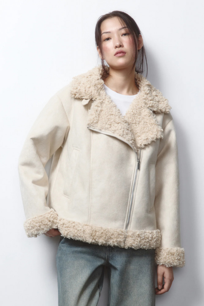Короткая женская куртка-дубленка свободного кроя из плотной искусственной замши с подкладкой из искусственного меха под овчину. V-образный вырез, широкий отложной воротник с лацканами и ремешками, которые позволят носить его как высокий воротник-стойку. Длинные прямые рукава с широкими манжетами с меховой отделкой. Застежка на косую молнию по всей длине. Два прорезных кармана без застежки. Прямой нижний край с меховой отделкой.