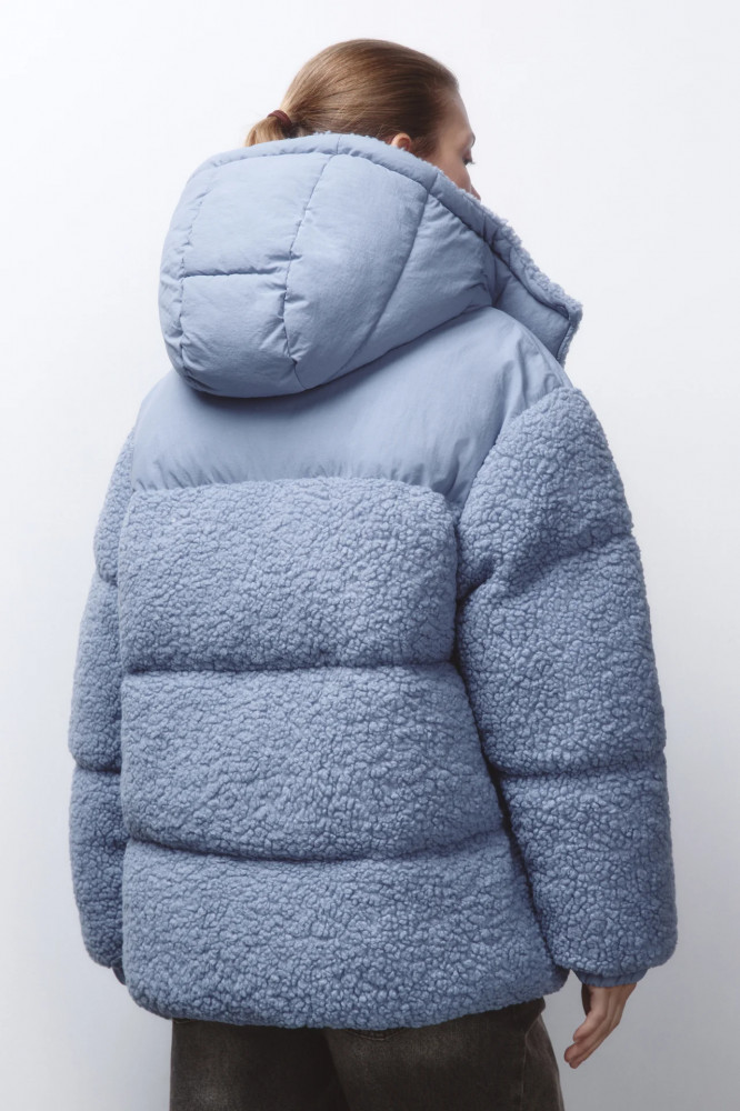 Стеганая женская куртка свободного кроя из искусственного меха с легким искусственным утеплителем (синтепух) и кокеткой из плащевой ткани. Высокий воротник-стойка с внутренней отделкой из искусственного меха для защиты от холода и мороза. Несъемный капюшон на кнопках. Длинные свободные рукава с прямыми манжетами и спущенной линией плеча. Застежка на молнию по всей длине. Два прорезных боковых кармана без застежки. Прямой нижний край без разрезов.