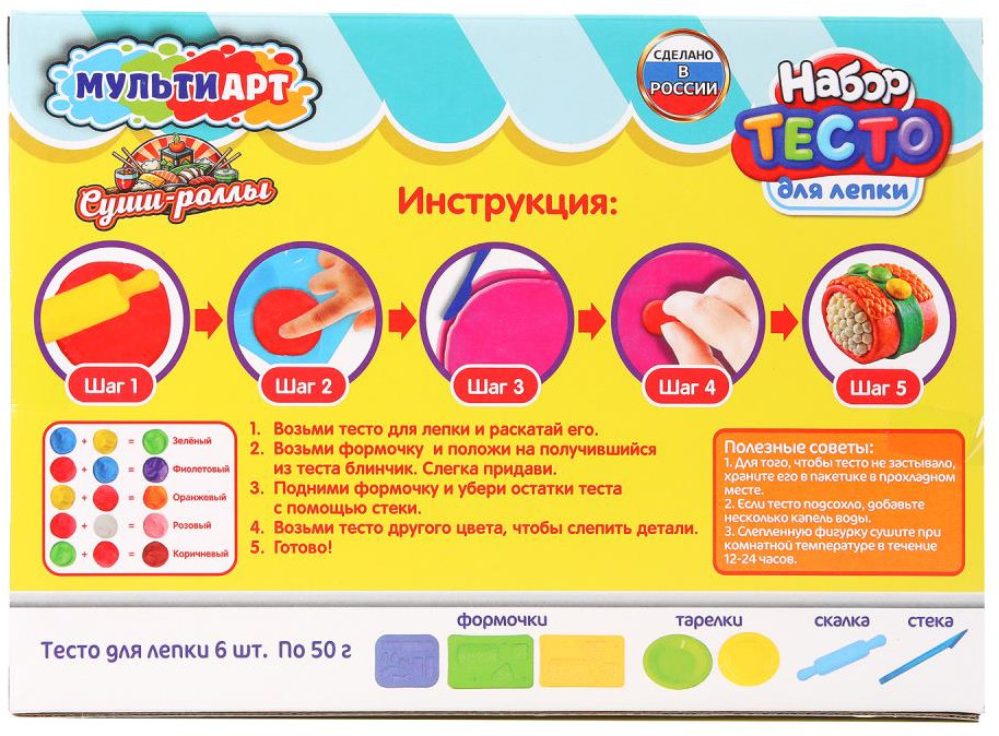 💳 Оплатить за товар можно при получении 🇰🇿 Есть бесплатная доставка по Казахстану от 1 дня 🎁 Копите бонусы с каждой покупки Набор с тестом для лепки и формочками «Суши-роллы» ТМ «Мульти Арт» — отличный вариант для развития творческих способностей ребёнка: |
