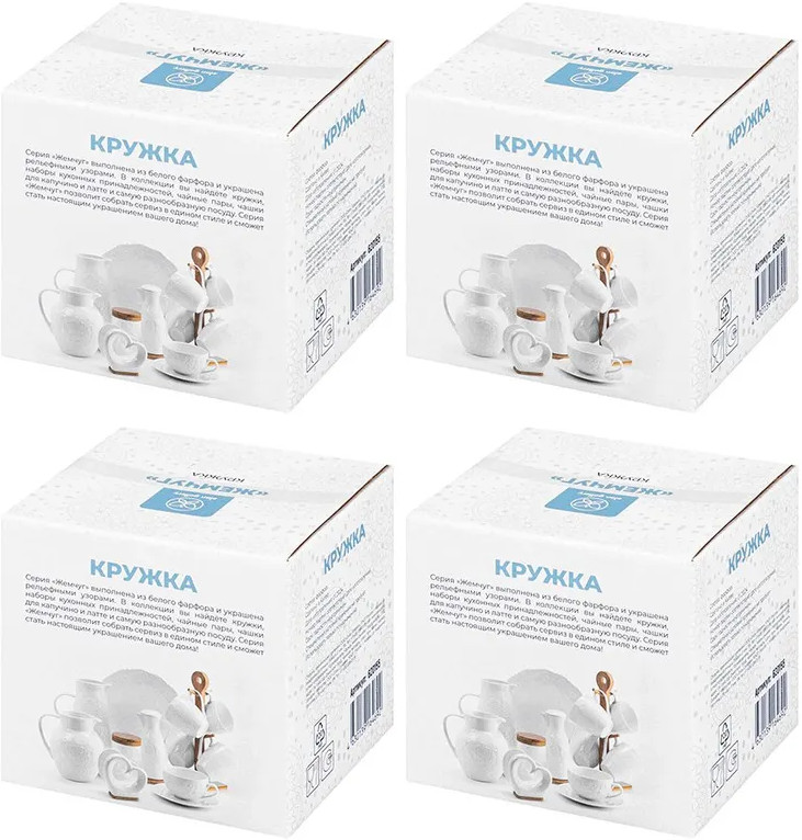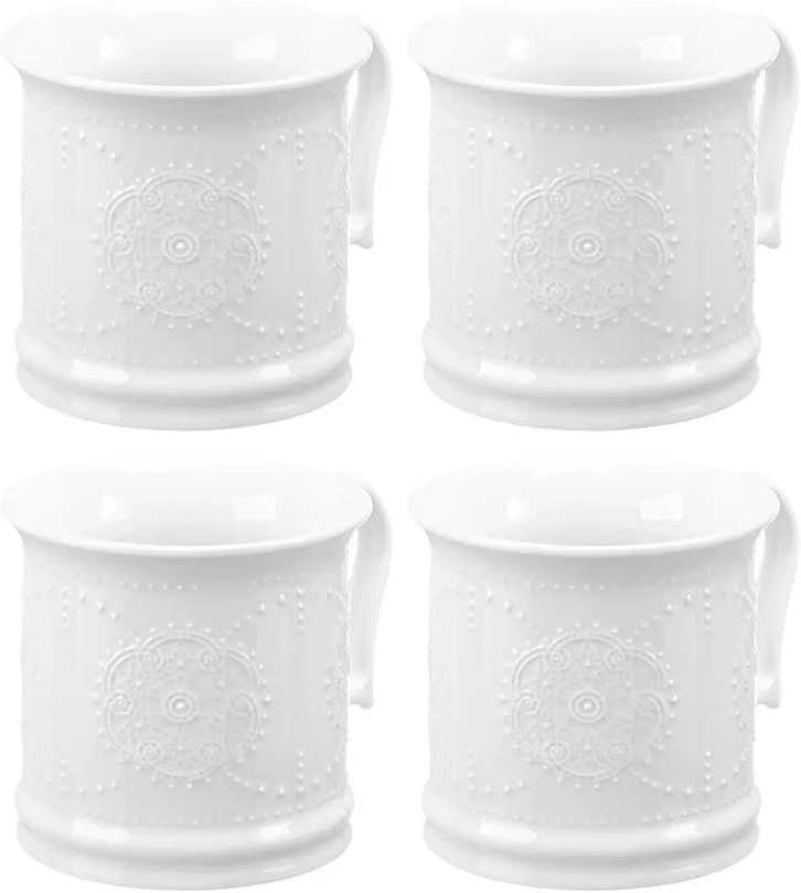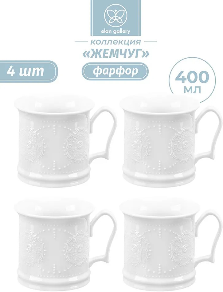 Набор 4 кружек «Жемчуг» предназначен для горячих и холодных напитков. Размер каждой кружки составляет 12,5×9,7×9,3 см, объём — 400 мл. Кружки выполнены из белого фарфора. Красивая декоративная посуда украсит ваш стол как на праздник, так и в будни! Кружки отлично дополнят приятные завтраки и уютные вечера. В холодные сезоны они помогут согреться чаем, кофе или какао, а летом — освежиться лимонадом или соком. Каждая чашка украшена рельефным узором, напоминающим жемчужную мандалу. Благодаря изящному дизайну кружки подойдут для сервировки стола: они будут сочетаться с любой скатертью и отлично дополнят интерьер вашей кухни или гостиной.