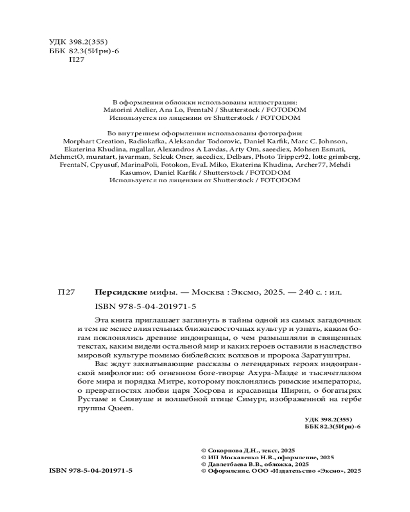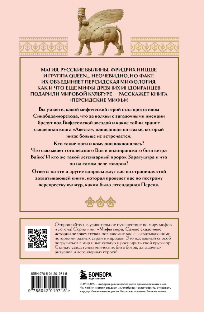 💳 Оплатить за товар можно при получении 🇰🇿 Есть бесплатная доставка по Казахстану от 1 дня 🎁 Копите бонусы с каждой покупки Серия: Мифы мира. Самые сказочные истории человечества Среди зыбучих песков времени, где цивилизации рождаются и умирают под напором вековых бурь, существовала одна не похожая на другие — ее миражи мы видим в герое греческих мифов Геракле и дионисийских плясках, сказках «Тысячи и одной ночи» и современных философских учениях. Персия, древнее и могущественное царство, подарила нам истории о таинственных богах и легендарных героях, о вечной борьбе света и тьмы, священном огне зороастризма и магах, постигших тайны мироздания. А что еще персидская цивилизация оставила в наследство мировой культуре, читайте в книге «Персидские мифы»! |