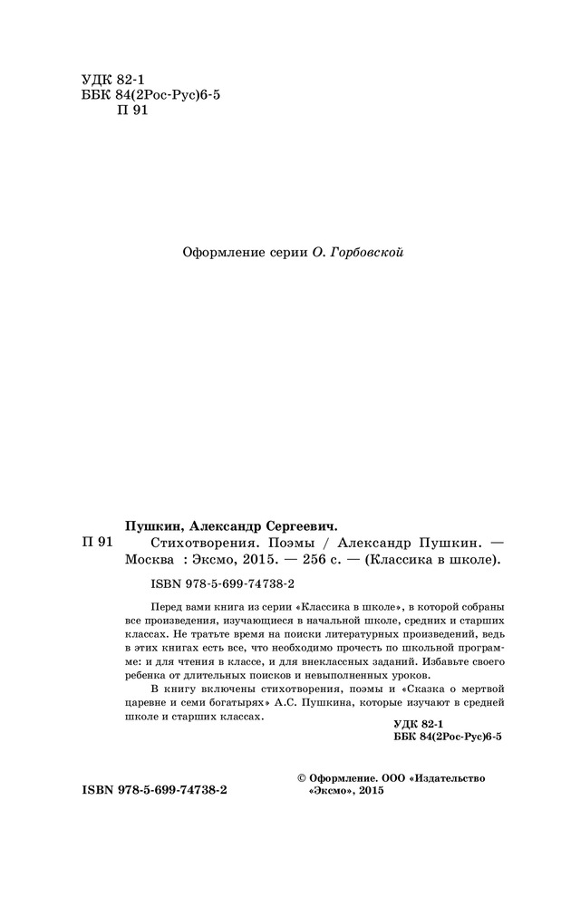В книгу включены стихотворения, поэмы и "Сказка о мертвой царевне и семи богатырях" А.С. Пушкина, которые изучают в средней школе и старших классах. |