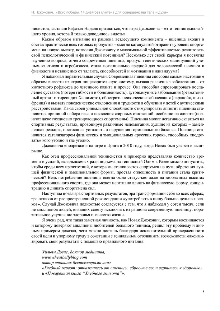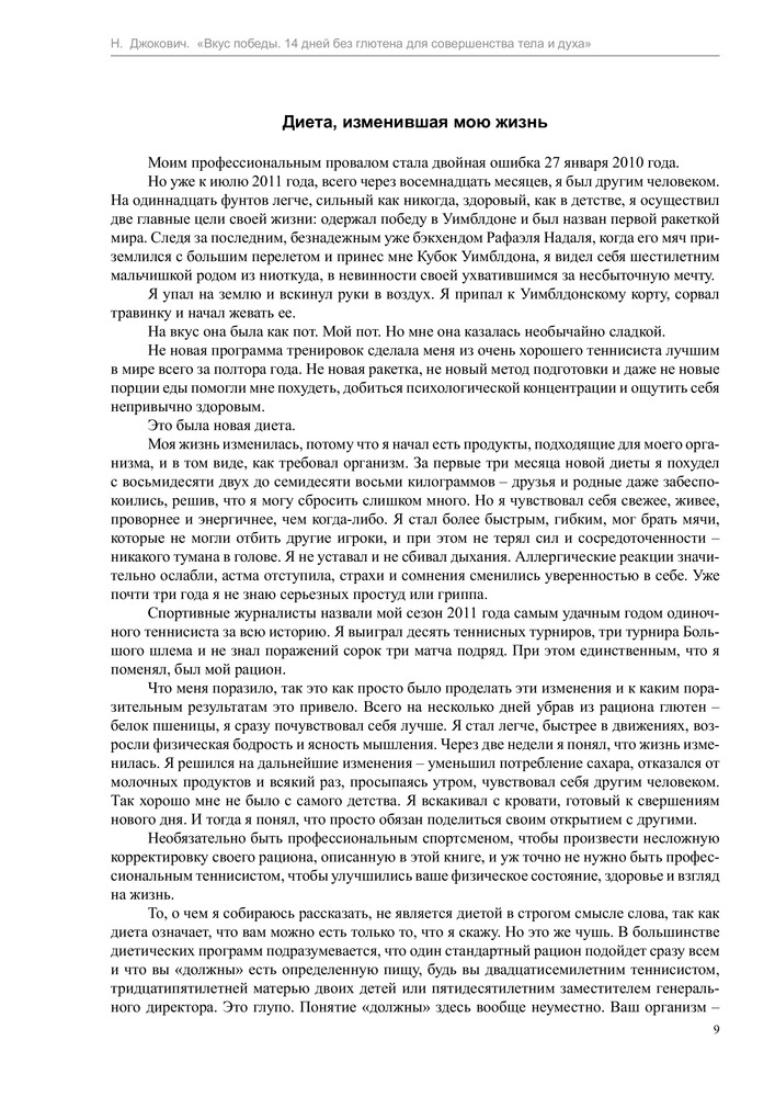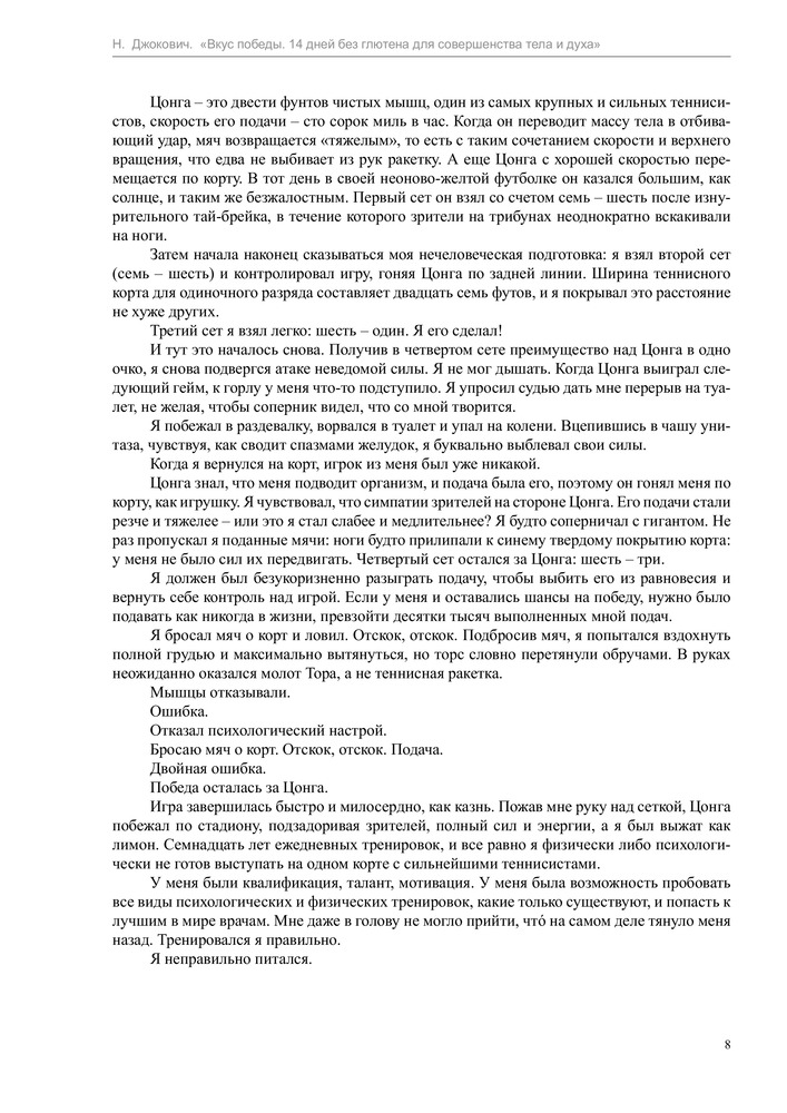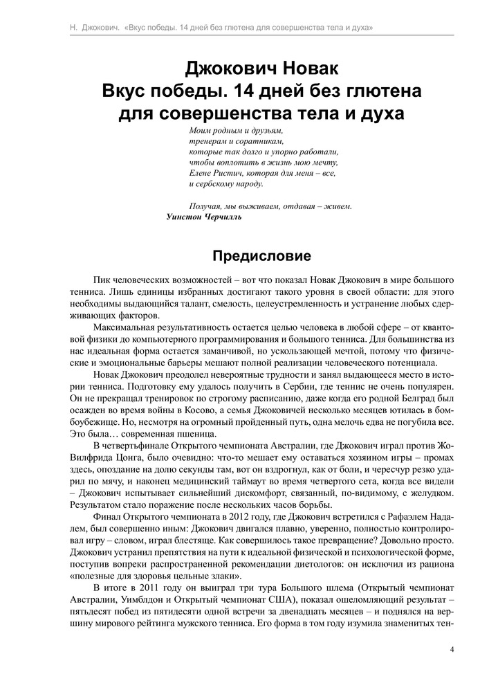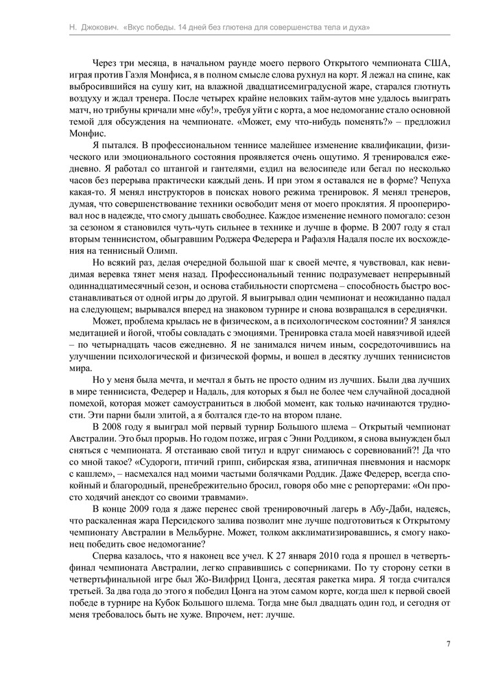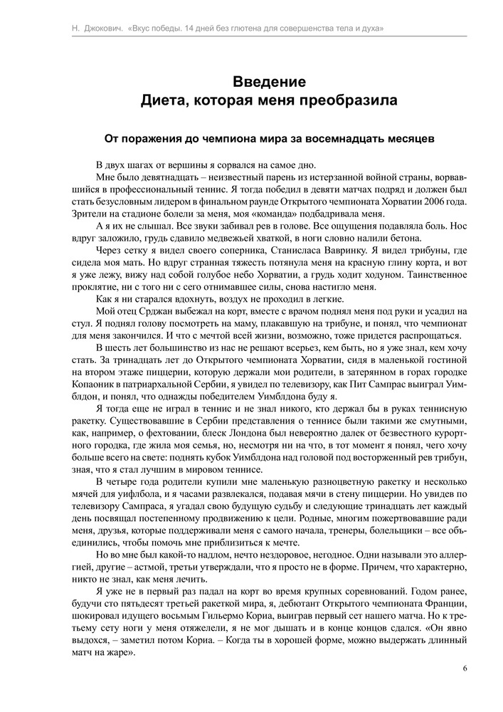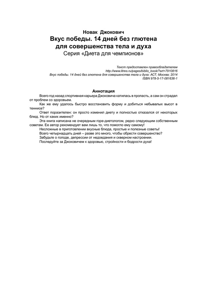Вкус победы. 14 дней без глютена для совершенства тела и духаВ данный момент этот товар отсутствует в продаже. Возможно, у нас найдется аналогичный или похожий товар здесь. Серия: Диета для чемпионов Новак Джокович – один из лучших теннисистов всех времен и народов, первая ракетка мира, шестикратный победитель турниров Большого шлема, двукратный победитель Мирового тура АТР, обладатель Кубка Дэвиса, вошедший в список «100 самых влиятельных людей мира» журнала «TIME». Всего год назад спортивная карьера Джоковича катилась в пропасть, а сам он страдал от проблем со здоровьем. |