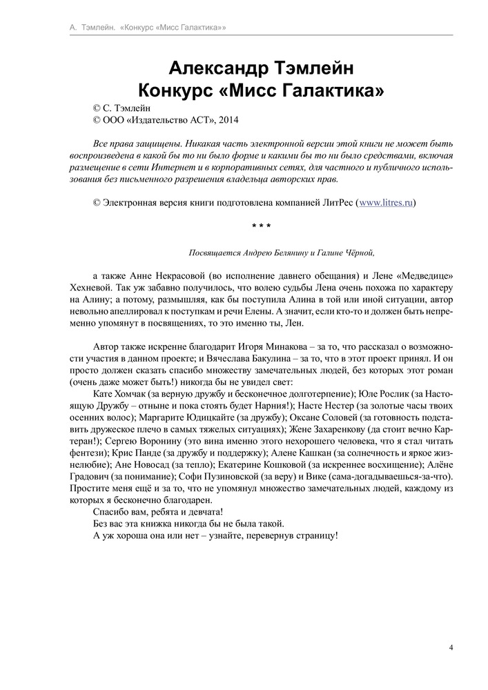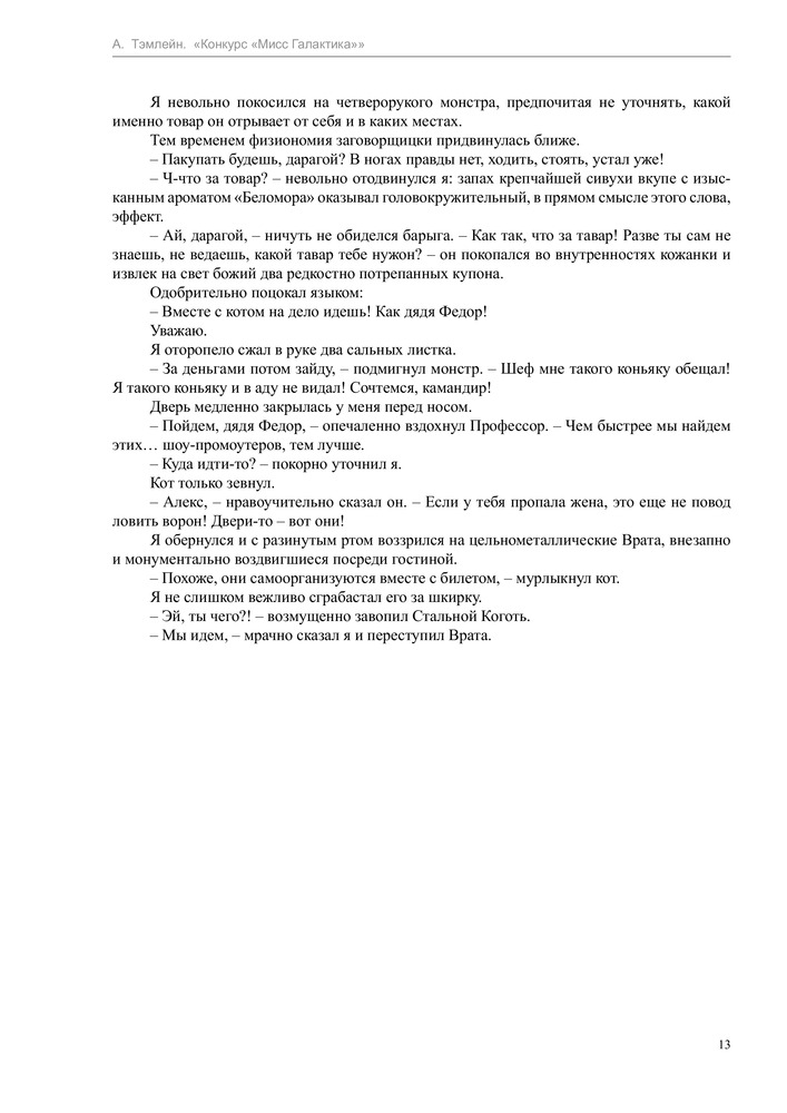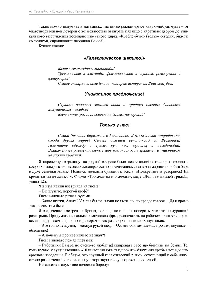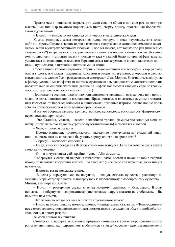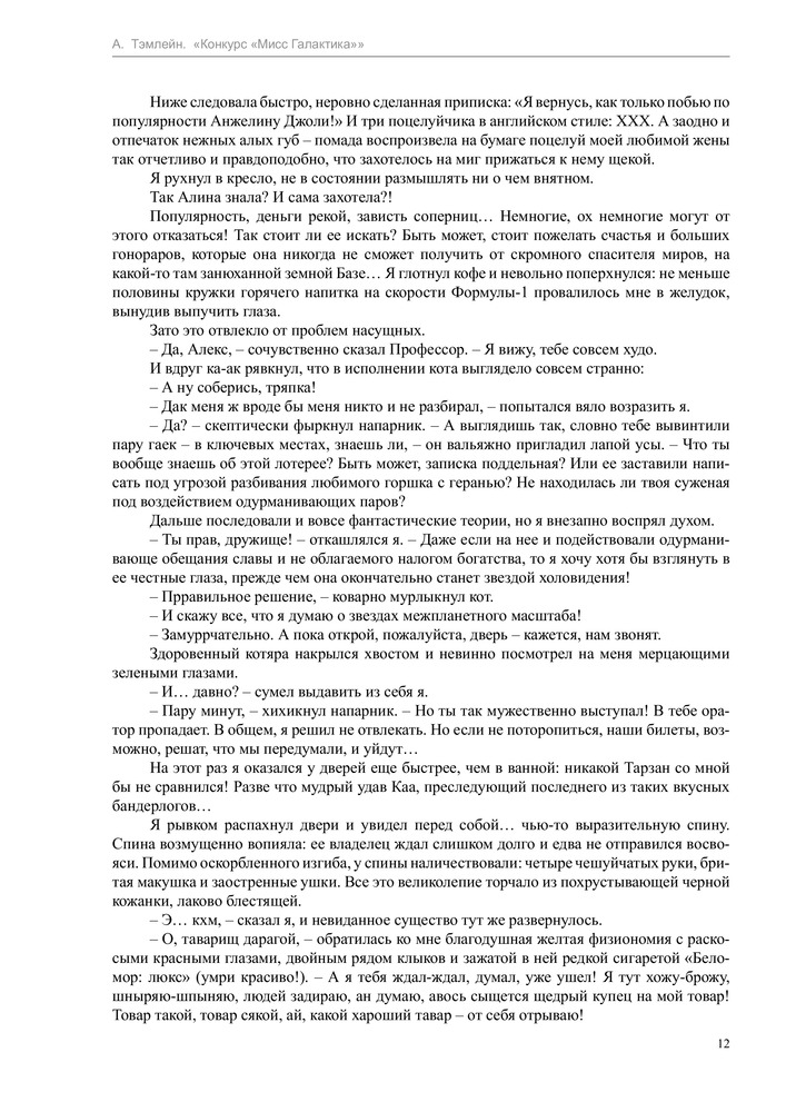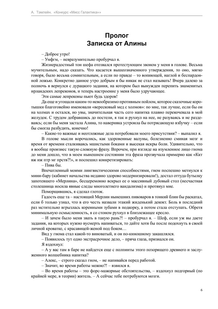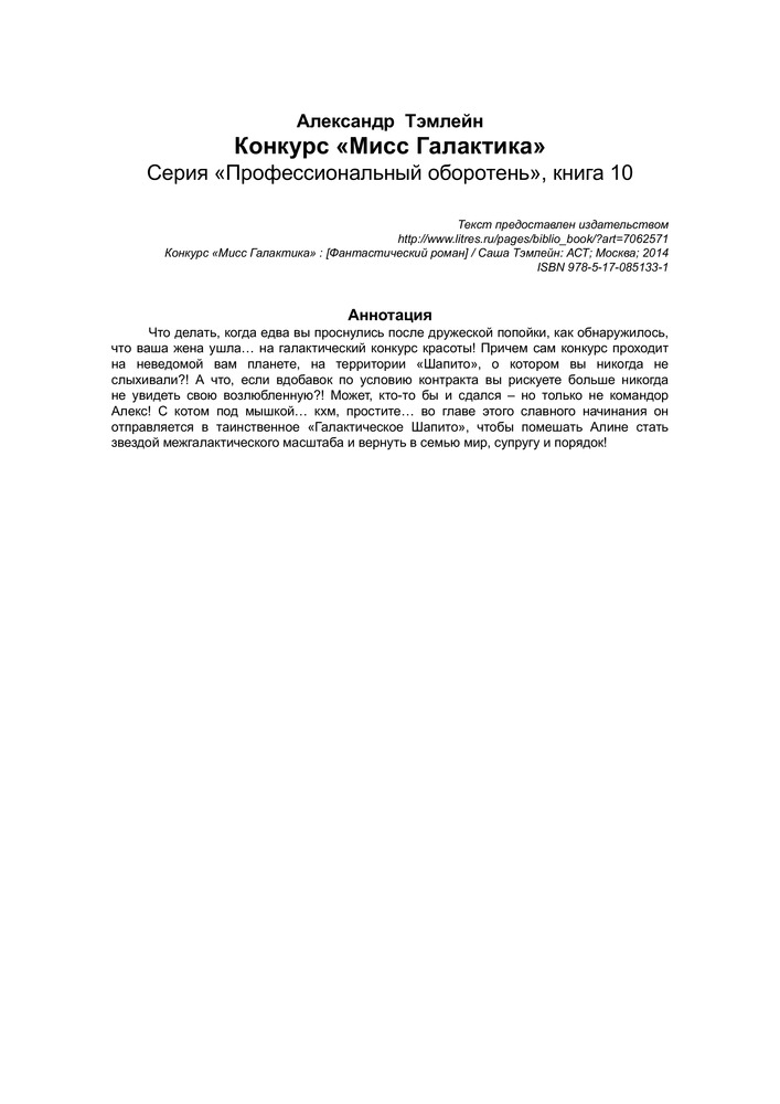 Конкурс "Мисс Галактика"В данный момент этот товар отсутствует в продаже. Возможно, у нас найдется аналогичный или похожий товар здесь. Серия: Профессиональный оборотень Что делать, когда едва вы проснулись после дружеской попойки, как обнаружилось, что ваша жена ушла… на галактический конкурс красоты! Причем сам конкурс проходит на неведомой вам планете, на территории «Шапито», о котором вы никогда не слыхивали?! А что, если вдобавок по условию контракта вы рискуете больше никогда не увидеть свою возлюбленную?! Может, кто-то бы и сдался – но только не командор Алекс! С котом под мышкой… кхм, простите… во главе этого славного начинания – они отправляются в таинственное «Галактическое Шапито», чтобы помешать Алине стать звездой межгалактического масштаба и вернуть в семью мир, супругу и порядок! |
