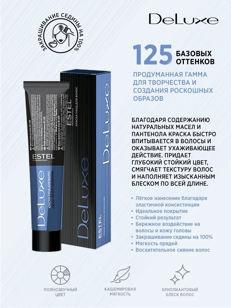 Продуманная гамма для творчества и создания роскошных образов. Благодаря содержанию натуральных масел и пантенола краска быстро впитывается в волосы и оказывает ухаживающее действие. Краска Эстель Делюкс придает глубокий стойкий цвет, смягчает текстуру волос и наполняет изысканным блеском по всей длине.