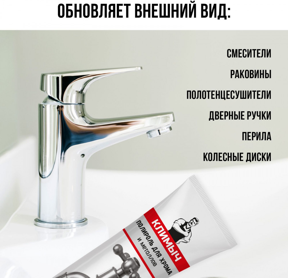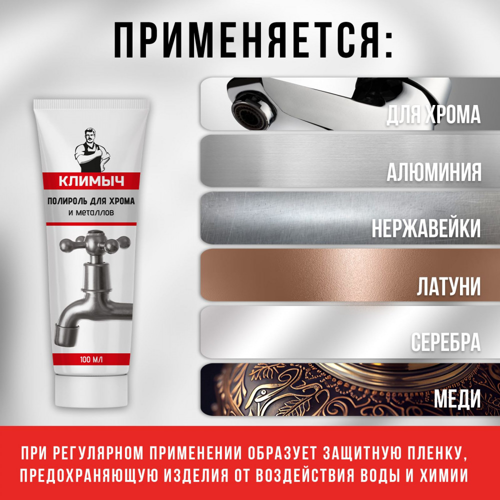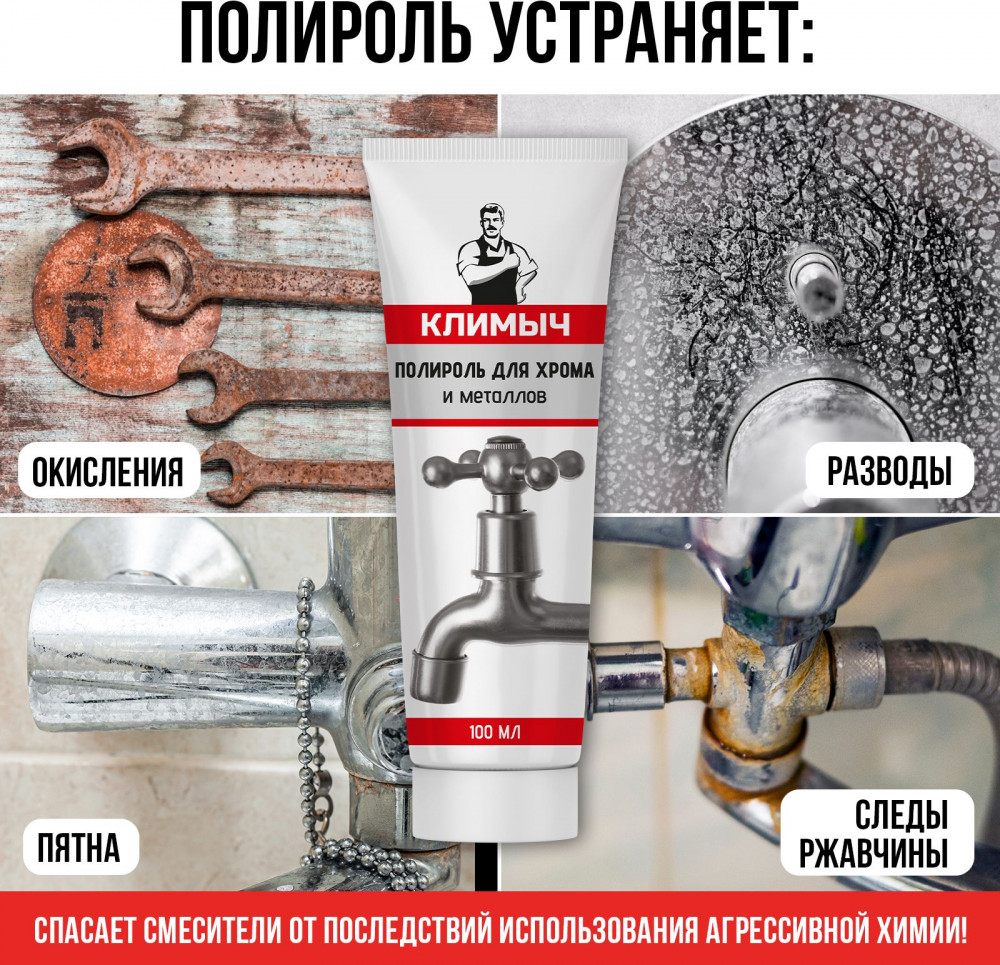 Полировальная паста — это профессиональное средство для чистки и ухода за металлическими поверхностями, включая смесители, раковины, диски колес и другие детали. Многофункциональный абразивный очиститель идеален для удаления мелких царапин, а также помогает устранить окисление, грязь и разводы, пятна и ржавчину. А воск в составе полироли создает защитную глянцевую пленку, которая защищает металл от воздействия агрессивных веществ и продлевает его срок службы. Восстановитель подходит для таких металлов, как: хром и нержавеющая сталь, а также используется для полировки алюминия, латуни, серебра, мельхиора и меди.