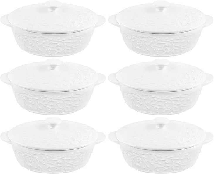 Серия: Веточки-цветочки Набор из 6 жюльенниц-кокотниц Elan Gallery «Веточки-цветочки» с крышками выполнен из белого фарфора в классическом дизайне. Посуда серии украшена рельефным узором в виде изящных веточек с маленькими цветочками. Размер каждой жюльенницы — 16×10×8 см, объём — 250 мл, высота без крышки — 5 см, внутренний размер — 12,5×8,5×4,5 см. Светлая Пасха — один из главных праздников весны! Мы разработали коллекцию сезонных товаров для дома, которые помогут создать радостную и уютную атмосферу в квартире или на даче. Пасхальный декор преобразит домашний интерьер и поможет встретить праздник в кругу любимых. Формы с крышечками можно использовать как для приготовления жюльена, так и для разнообразных десертов, кондитерских и кулинарных изделий. Красивые жюльенницы после приготовления можно сразу подавать на стол. Фарфоровая посуда отличается от керамической повышенной плотностью. Фарфор не впитывает цвет продуктов и не деформируется от влаги, чему может быть подвержена керамика. |