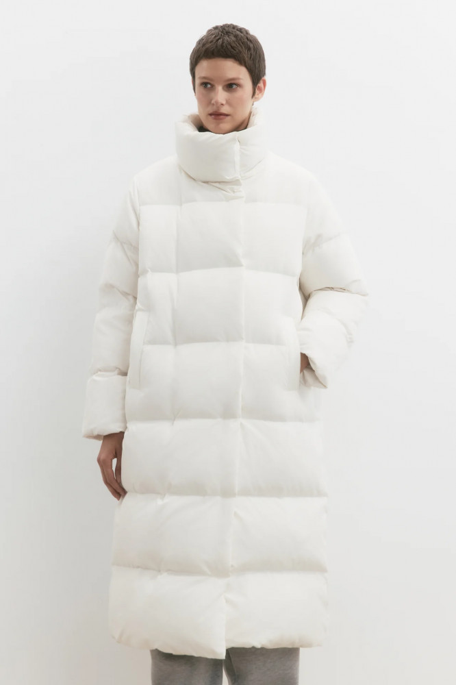 Длинный женский стеганый пуховик свободного кроя из ткани с плащевой фактурой с натуральным утеплителем (пух 50%, перо 50%). Высокий воротник-стойка без капюшона, который при желании (или когда станет жарко) можно носить как отложной. Застежка на планку с кнопками по всей длине. Длинные рукава с присборенными манжетами и спущенной линией плеча. Два боковых прорезных кармана без застежки. Прямой нижний край без утяжек.