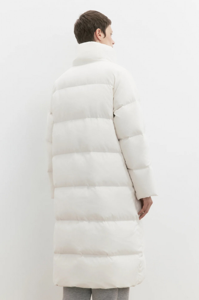 Длинный женский стеганый пуховик свободного кроя из ткани с плащевой фактурой с натуральным утеплителем (пух 50%, перо 50%). Высокий воротник-стойка без капюшона, который при желании (или когда станет жарко) можно носить как отложной. Застежка на планку с кнопками по всей длине. Длинные рукава с присборенными манжетами и спущенной линией плеча. Два боковых прорезных кармана без застежки. Прямой нижний край без утяжек.