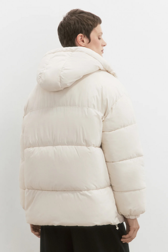 Стеганая женская куртка свободного кроя из гладкой ветроотталкивающей ткани с плащевой фактурой с легким искусственным утеплителем (синтепух). Высокий воротник-стойка и несъемный капюшон с утяжками на стопперах и с застежкой на кнопки. Длинные свободные рукава с присборенными манжетами и спущенной линией плеча. Застежка на молнию. Два прорезных боковых кармана без застежки. Прямой нижний край с утяжками на стопперах по бокам.