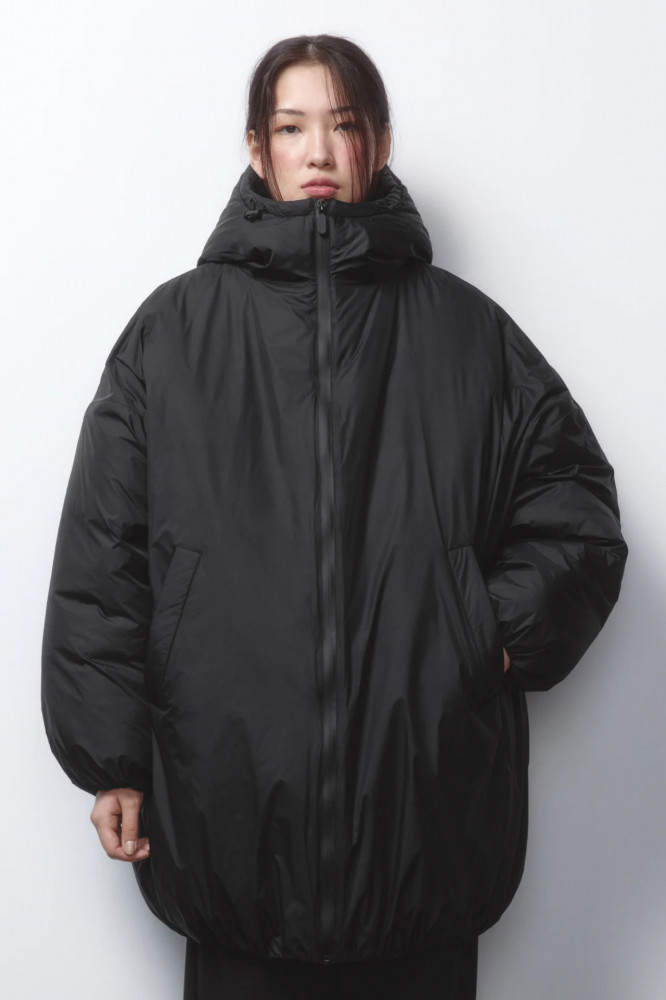Удлиненная женская куртка-бомбер свободного кроя oversize из плотной ткани с гладкой плащевой фактурой и искусственным утеплителем (синтепон). Высокий воротник-стойка и несъемный капюшон на утяжках со стопперами. Длинные свободные рукава с присборенными манжетами и спущенной линией плеча. Застежка на молнию по всей длине спереди. Два прорезных боковых кармана без застежки. Присборенный нижний край.
