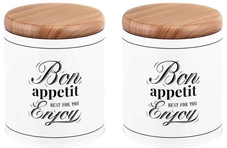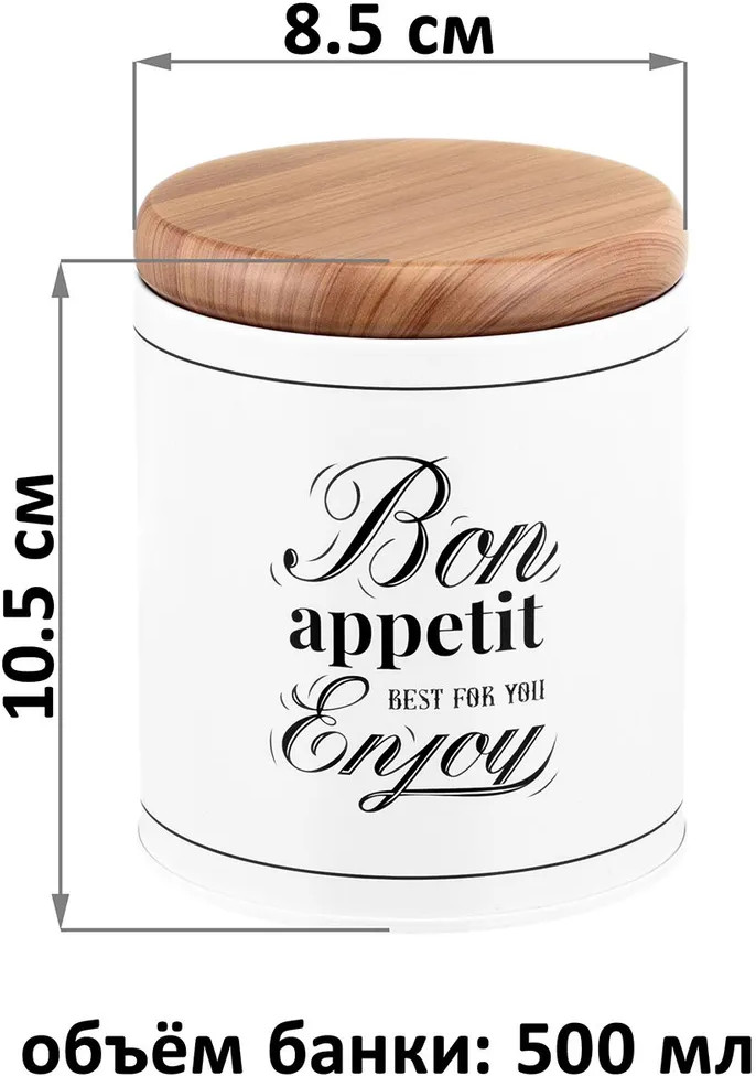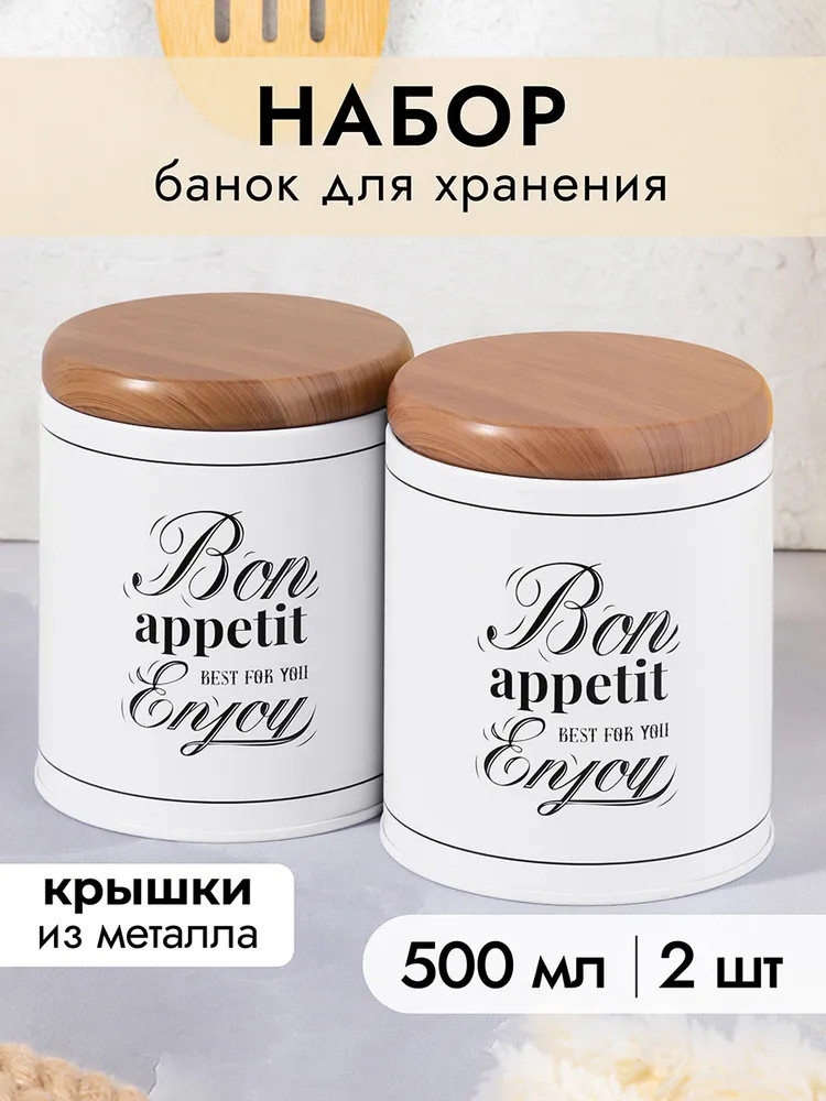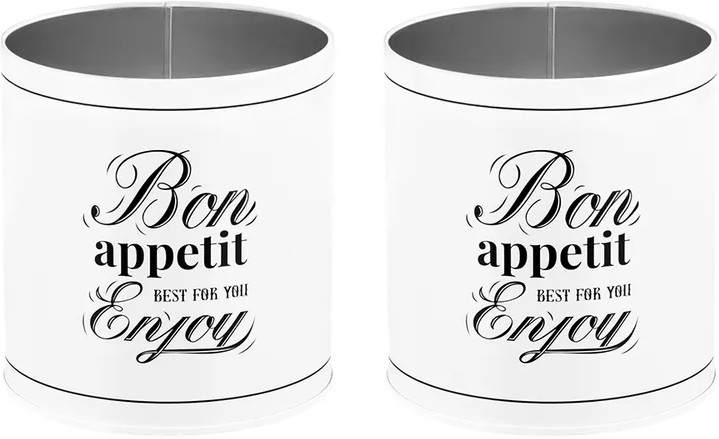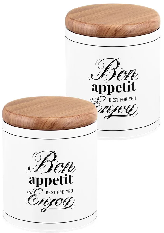 Набор 2 банок для хранения послужит органайзером на вашей кухне. Размер каждой ёмкости — 8,5×8,5×10,5 см, объём — 500 мл. Выполнены из жести. «Bon Appetit» — это коллекция посуды в стиле френч-винтаж, которая создаст на вашей кухне атмосферу романтики и уюта. Отличительные черты серии — это сочетание светлых оттенков и монохромной картинки, стилизованной под ретро. Лаконичная фраза «Bon Appetit. Best for you. Enjoy» («Приятного аппетита. Лучшее — для вас. Наслаждайтесь») добавит изысканности интерьеру вашей кухни. Крышки изделий визуально имитируют древесину. Каждая баночка отлично подойдёт для разнообразных сыпучих продуктов: чая, кофе, сахара и соли, приправ и специй. Храните в них крупы, ягоды, орехи и сухофрукты. Заполните контейнеры маленькими сладостями: конфетами, леденцами или драже. Подайте баночки к столу, чтобы идеально дополнить чайную сервировку!