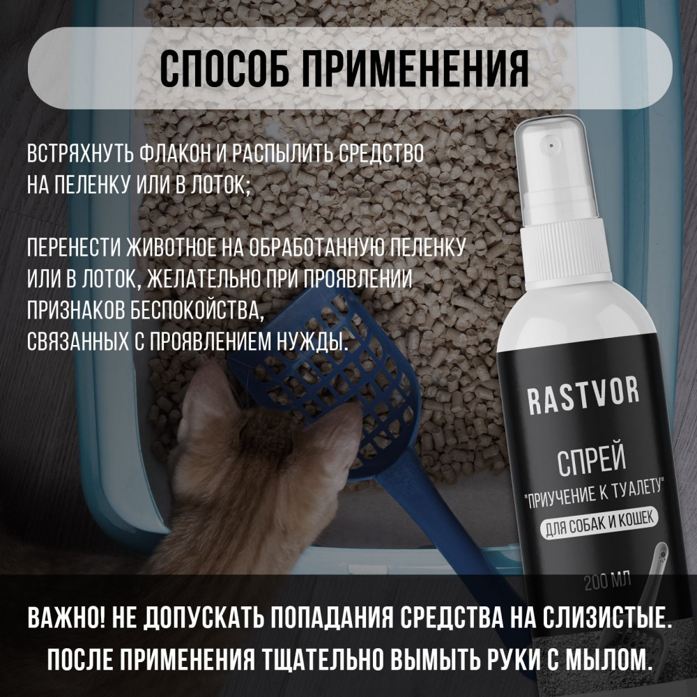 RASTVOR Спрей для собак и кошек «Приучение к туалету»В данный момент этот товар отсутствует в продаже. Возможно, у нас найдется аналогичный или похожий товар здесь. Спрей «Приучение к туалету» представляет собой эффективное средство для обучения животных, позволяющее приучить кошек и собак старше шести месяцев к удобному месту для справления нужды, будь то лоток или пеленка. Одним из его явных преимуществ является отсутствие аммиака в составе, что делает его безопасным для использования. Для того чтобы достичь желаемого результата, необходимо правильно использовать данный спрей для туалета. В процессе обучения важно тщательно следовать инструкции. Во-первых, перед распылением необходимо хорошенько встряхнуть флакон. Затем, спрей рекомендуется наносить на пеленку или внутрь лотка, чтобы создать привлекательный аромат для вашего питомца. Когда вы заметите, что ваше животное проявляет беспокойство или начинает вести себя так, как будто готовится к справлению нужды, следует перенести его на заранее обработанную поверхность. Это поможет ему ассоциировать это место с нужными действиями. Регулярность — ключ к успеху: спрей необходимо применять как минимум 1-2 раза в день для достижения устойчивого результата. Процесс приучения к лотку для кошек зачастую требует терпения и последовательных действий. |