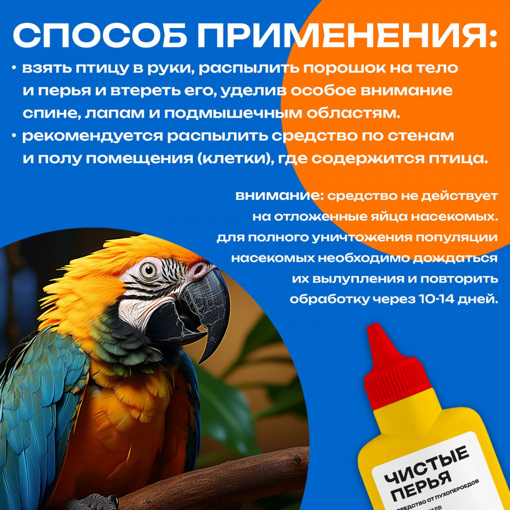 В данный момент этот товар отсутствует в продаже. Возможно, у нас найдется аналогичный или похожий товар здесь. Средство от вшей, клещей и пухопероедов — это специальный состав для уничтожения пухоедов, пероедов, перьевых клещей и блох на теле и крыльях домашних птиц: попугаев, канарейки, амадин, голубей, кур и других. Оно не имеет запаха и подходит для ухода за птицей всех возрастов. Порошок высушивает и уничтожает вредителей, не причиняя вреда вашему питомцу, благодаря чему его перья остаются чистыми и здоровыми. Гибель паразитов происходит через несколько часов или дней, в зависимости от количества состава, попавшего на них.
