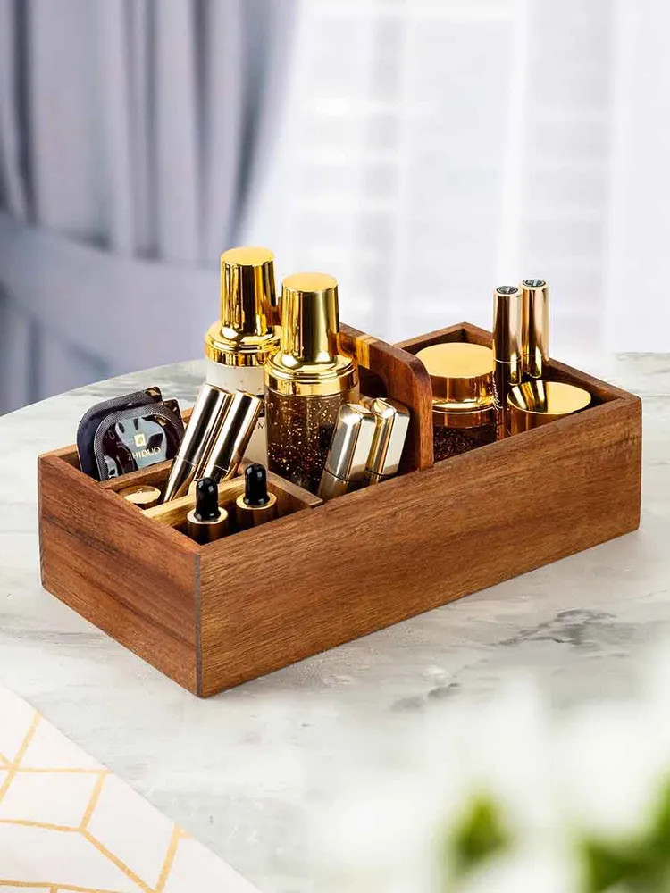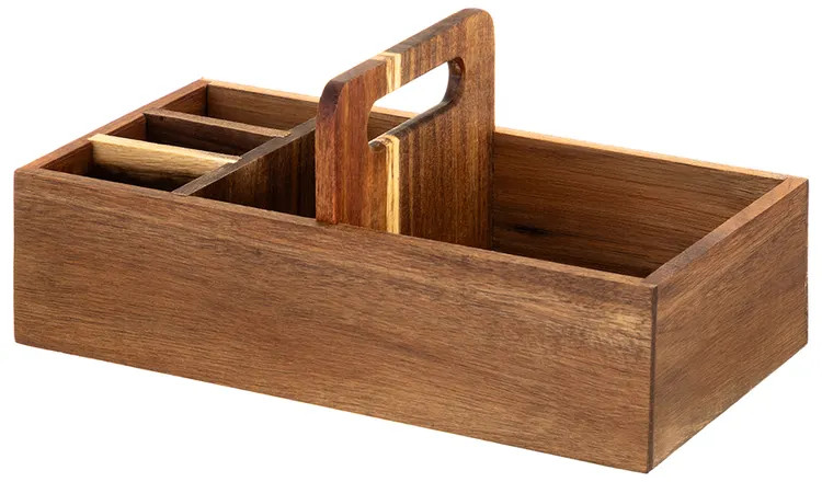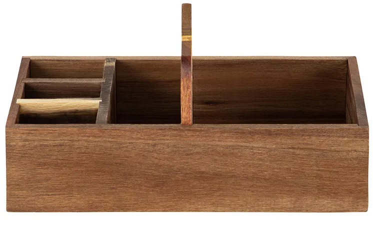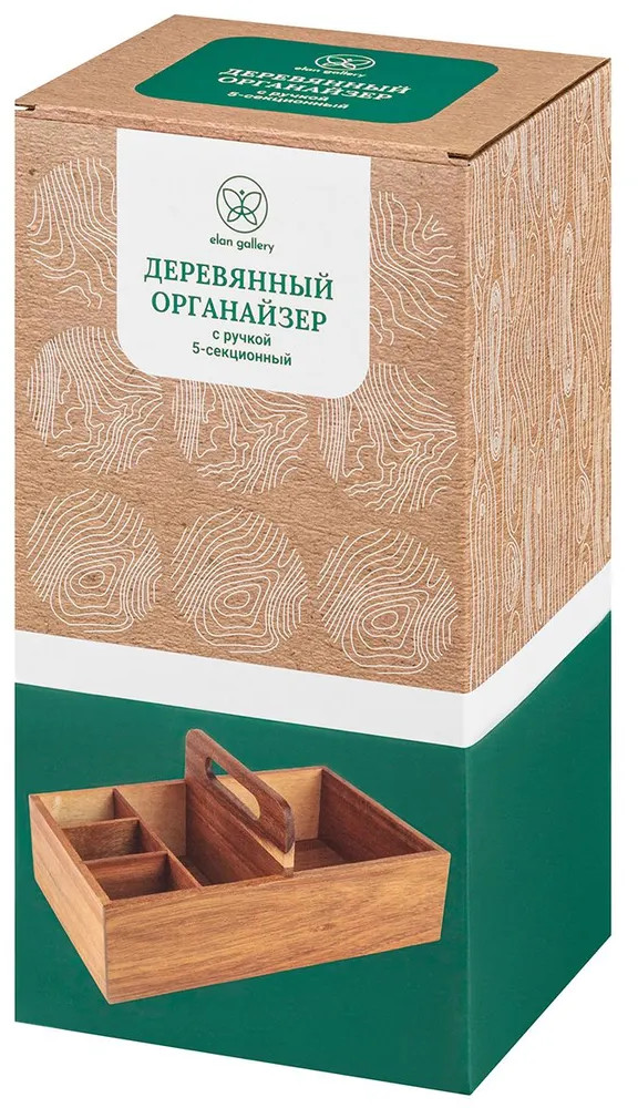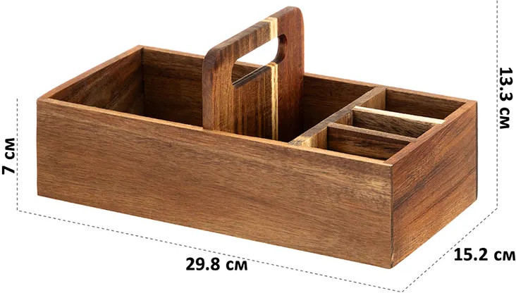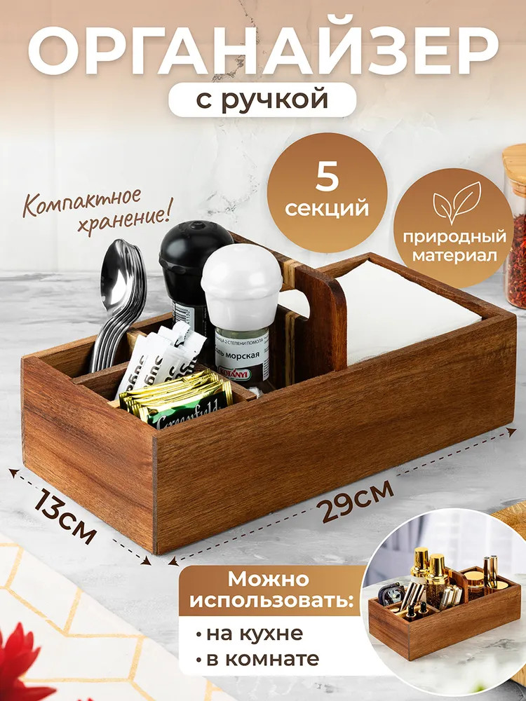 Настольный органайзер с ручкой и 5 секциями 29,8×15,2×13,3 см — это стильное решение для создания порядка в вашем доме. Выполнен из натурального дерева акации. Он привнесёт в интерьер нотки уюта и природной эстетики! 5 отделений с перегородками формируют удобные ячейки для мелочей, кухонных принадлежностей, чайных пакетиков и салфеток. Разделители не вынимаются! Размеры ячеек: 13,5×13,5×7 см, 13,5×6х7 см, 6,5×3,5×7 см и две по 6,5×4х7 см. Органайзер можно разместить на столе, полке или в шкафу. Деревянный контейнер станет компактной системой хранения пакетов со сладостями и печеньем, а также коробочек с чаем. Подойдёт к любому интерьеру кухни, прихожей или комнаты. В бокс можно поставить банки с кофе и другими сыпучими продуктами, ёмкости со специями и приправами, бутылки с маслами и столовый инвентарь. В спальне он превратится в подставку для флаконов с кремами, духов и парфюма, а также бижутерии и украшений.