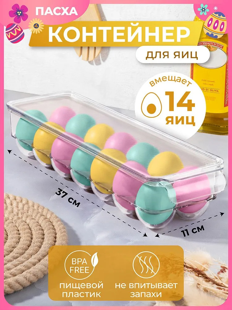 Контейнер на 14 яиц предназначен для организации хранения продуктов на вашей кухне. Размер изделия — 37×11×7,8 см. Выполнено из лёгкого и безопасного для пищевых продуктов пластика, устойчивого к влаге и посторонним запахам, благодаря чем он сохраняет свежесть содержимого. Светлая Пасха — один из главных праздников весны! Мы разработали коллекцию сезонных товаров для дома, которые помогут создать радостную и уютную атмосферу в квартире или на даче. Пасхальный декор преобразит домашний интерьер и поможет встретить праздник в кругу любимых.
