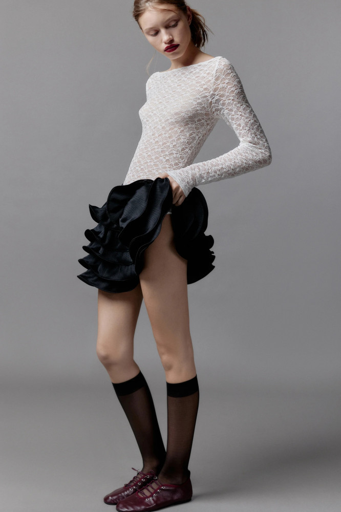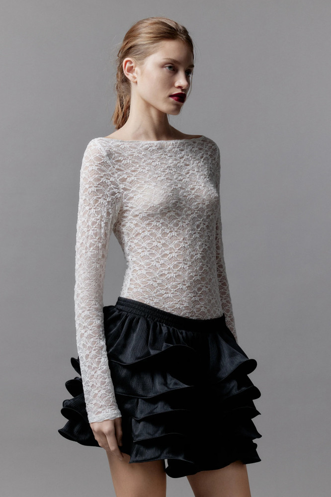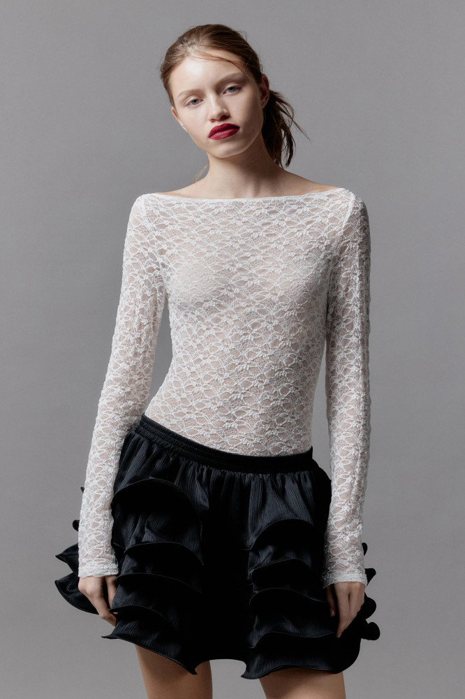 Женское боди облегающего кроя из тонкой, гладкой, прозрачной кружевной ткани без подкладки. Вырез-лодочка, закрытая спинка. Длинные облегающие рукава с прямыми манжетами и прямой линией плеча. Удобные бесшовные трусики-бразильяна с застежкой на кнопки снизу. Однотонное кружевное боди в базовых оттенках. Прозрачное боди — тренд этого сезона. Сочетай его с объемным низом в рабочем стиле, показывая в образе сразу и мягкие, и строгие черты своего характера. Носи боди отдельно или в составе многослойных образов. Создавай с ним образы на свидания, вечеринки или концерты. Будь смелой и надевай трендовое боди из кружева в офис в сочетании с юбками-карандаш, лодочками и облегающей блузкой, расстегнутой на все пуговицы. Надевай блузку-боди в качестве нижней майки под рваные джемперы в стиле гранж.