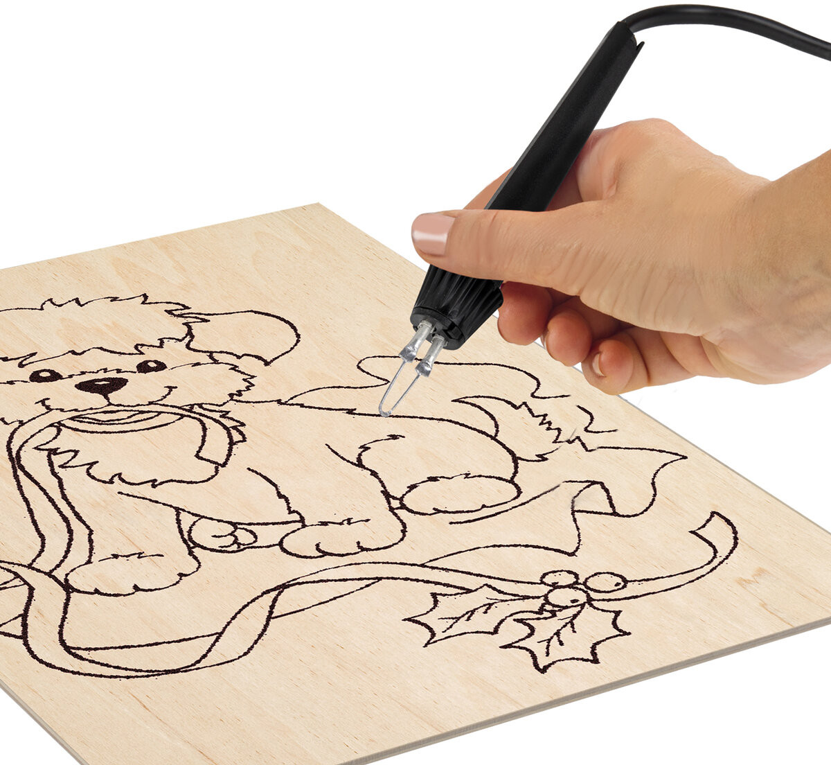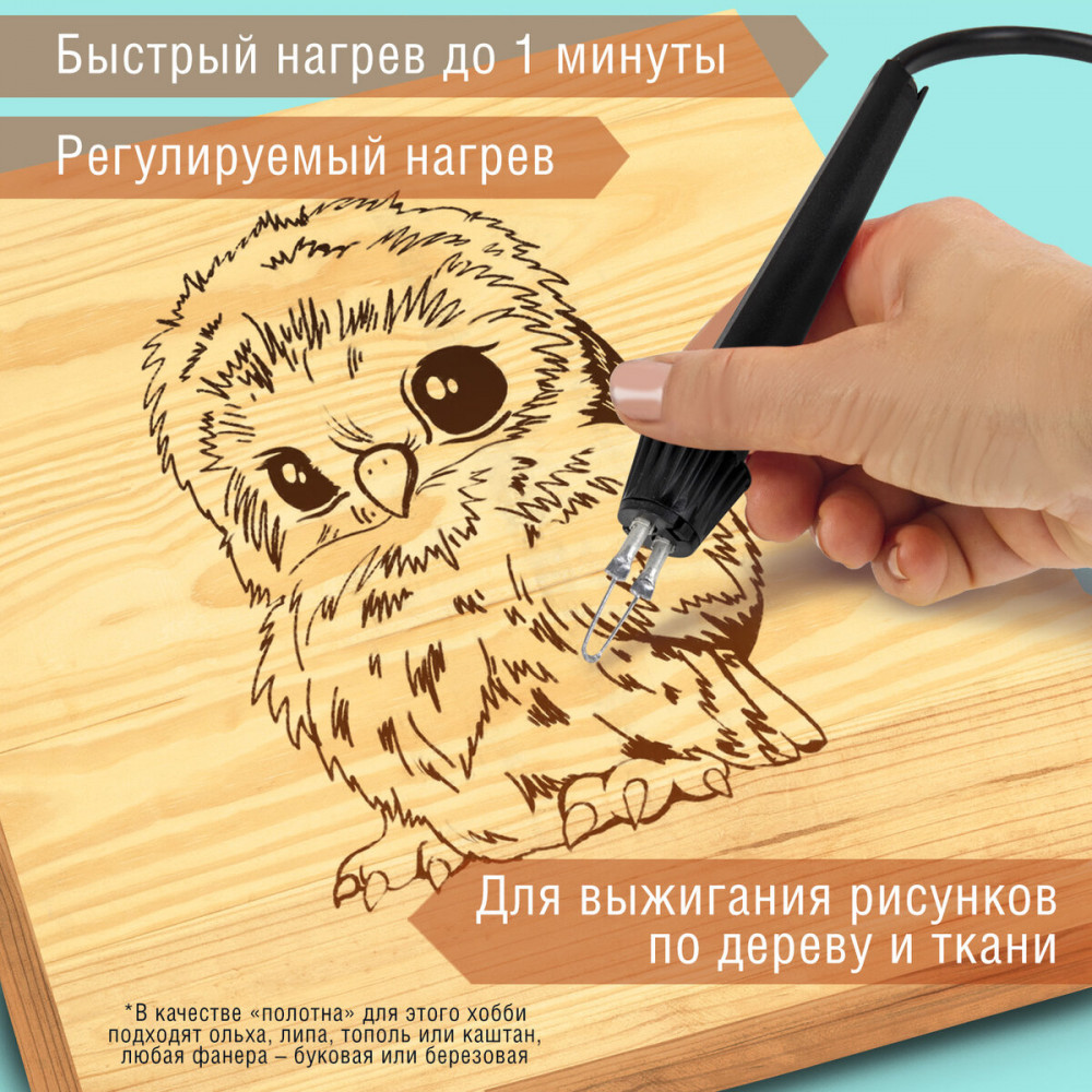В качестве «полотна» для этого хобби подходят ольха, липа, тополь или каштан, которые характеризуются светлой и однородной структурой древесины. Пригодна для использования и любая фанера — буковая или березовая. Игла специальной конструкции позволяет использовать прибор также для выжигания по синтетической ткани — капрону, искусственному шелку, полиэстеру, нейлону, тюлевой сетке. Узоры и изображения для выжигания можно придумать самостоятельно или же подобрать в книгах, а затем просто перенести на заготовку.