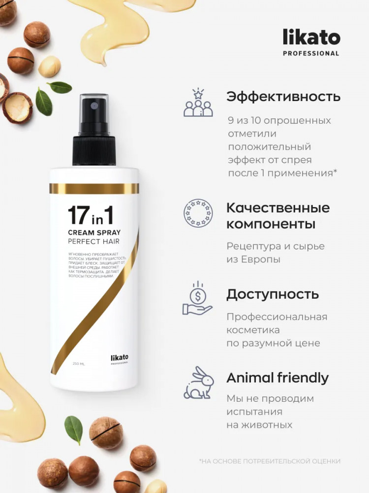 Спрей для легкого расчесывания 17в1 — универсальное профессиональное средство для ухода за волосами. Несмываемый спрей выполняет сразу несколько функций: увлажняет и питает волосы, облегчает их расчесывание, восстанавливает повреждения. Средство работает как эффективная термозащита для волос, обеспечивает защиту при использовании фена, плойки или утюжка. Спрей обладает уникальным составом и оказывает комплексное воздействие на волосы. В его состав входит кератин, коллаген, масло ши, вода и масса питательных веществ для придания локонам здорового вида. При использовании спрея можно забыть о распутывании непослушных волос. Волосы становятся гладкими как шелк, послушными, устраняется пушистость и электризация. Средство во флаконе с дозатором подходит для ежедневного ухода за тонкими, поврежденными волосами. Не тестируется на животных. Likato — косметика для лица, для волос, для тела,отвечающая высоким стандартам качества, а главное — запросам своего потребителя. Сделайте замечательный подарок от Ликато.