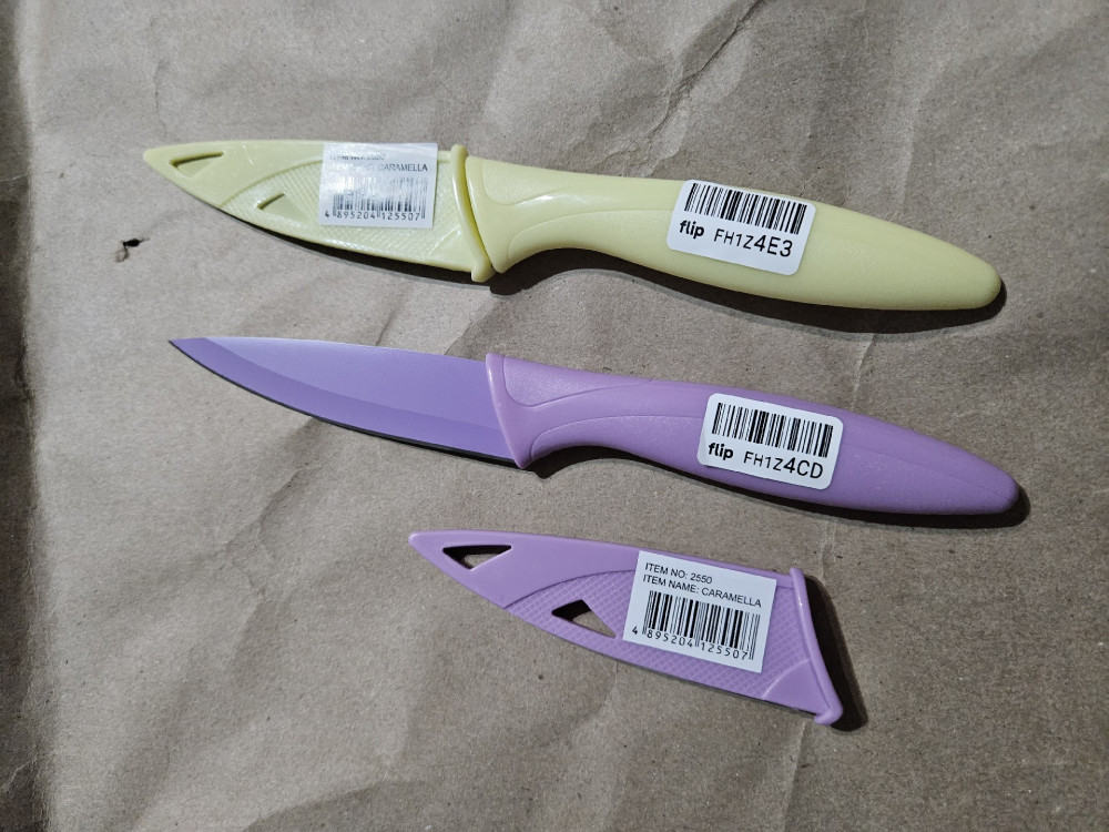Мне достался красивый желтенький нож. Первое время был супер острый, через месяц уже затупился немного, и на краях краска с лезвия стирается.