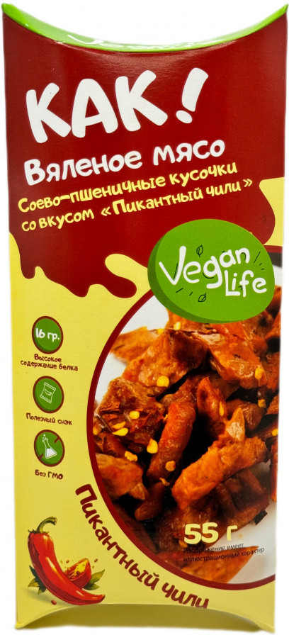 Vegan Life Соево-пшеничные кусочки со вкусом пикантного чили «Как вяленое мясо»В данный момент этот товар отсутствует в продаже. Возможно, у нас найдется аналогичный или похожий товар здесь. «Как вяленое мясо» — это соевые кусочки, изготовленные из соевых бобов и пшеницы, которые проходят процесс натурального копчения. Продукт отличается высоким содержанием растительного белка. Соево-пшеничное «Как вяленое мясо» обладает ароматом, вкусом и внешним видом, неотличимым от мясных продуктов благодаря использованию ароматных специй и натуральных пряностей. |