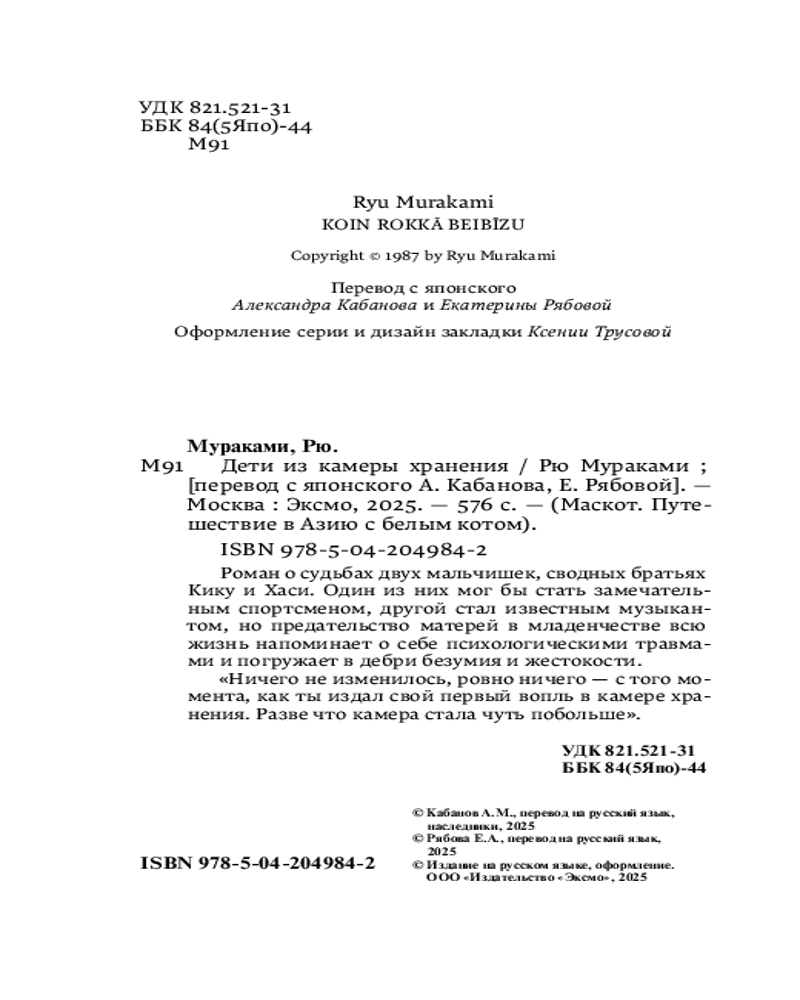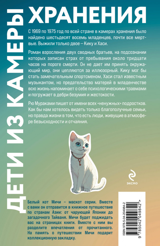 Дети из камеры храненияВ данный момент этот товар отсутствует в продаже. Возможно, у нас найдется аналогичный или похожий товар здесь. Серия: Маскот. Путешествие в Азию с белым котом Рю Мураками — основатель нового направления в японской литературе. Проза Рю Мураками — это смелые темы, щекочущие нервы сюжеты в духе триллеров и колющий психологизм. Автору свойственно критическое отображение реальности, исследование ее темных сторон и вскрытие проблем современного японского общества. |