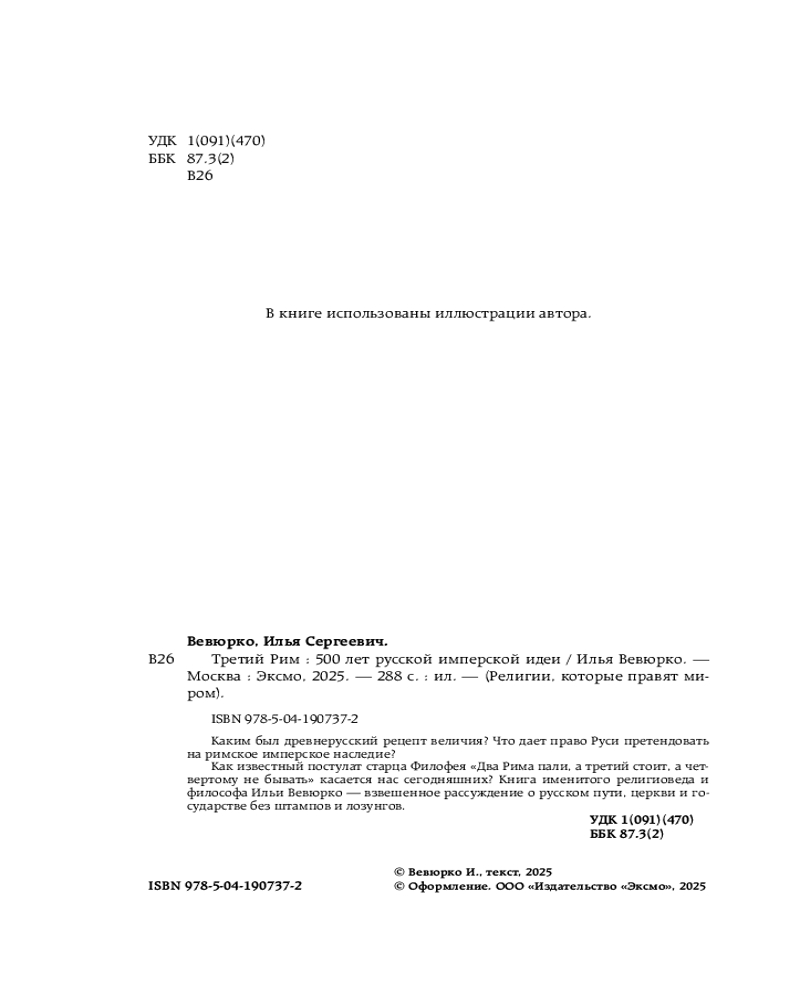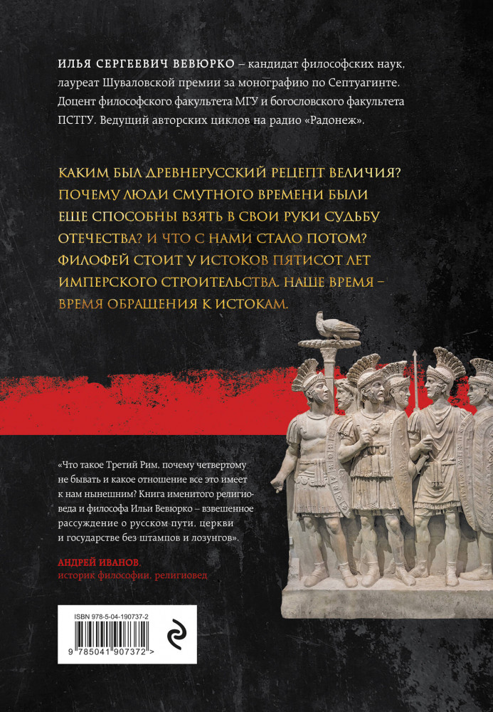 Третий Рим: 500 лет русской имперской идеиВ данный момент этот товар отсутствует в продаже. Возможно, у нас найдется аналогичный или похожий товар здесь. Серия: Религии, которые правят миром Книга именитого религиоведа и философа Ильи Вевюрко — взвешенное рассуждение о русском пути и церкви, о древнерусском рецепте величия и праве Руси претендовать на римское имперское наследие. |