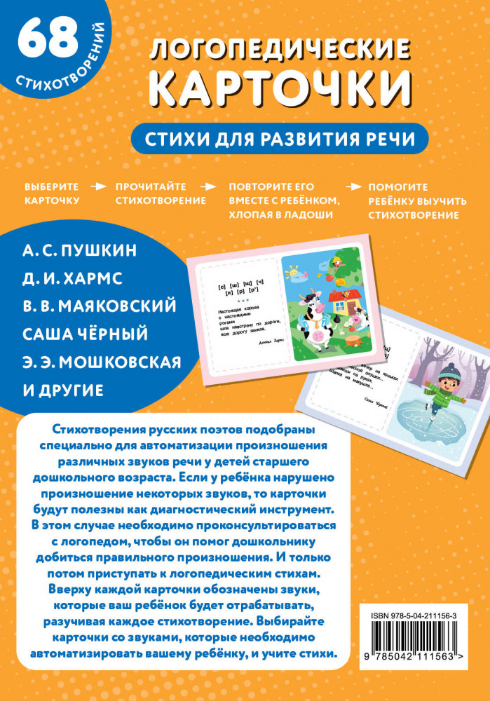 💳 Оплатить за товар можно при получении 🇰🇿 Есть бесплатная доставка по Казахстану от 1 дня 🎁 Копите бонусы с каждой покупки Серия: Развивающие карточки для детей Пособие под редакцией опытного педагога-логопеда С. В. Батяевой предназначено для развития речи детей дошкольного возраста. В комплекте 34 плотные двусторонние логопедические карточки со стихами русских поэтов, которые подобраны специально для автоматизации произношения детьми различных звуков речи. |