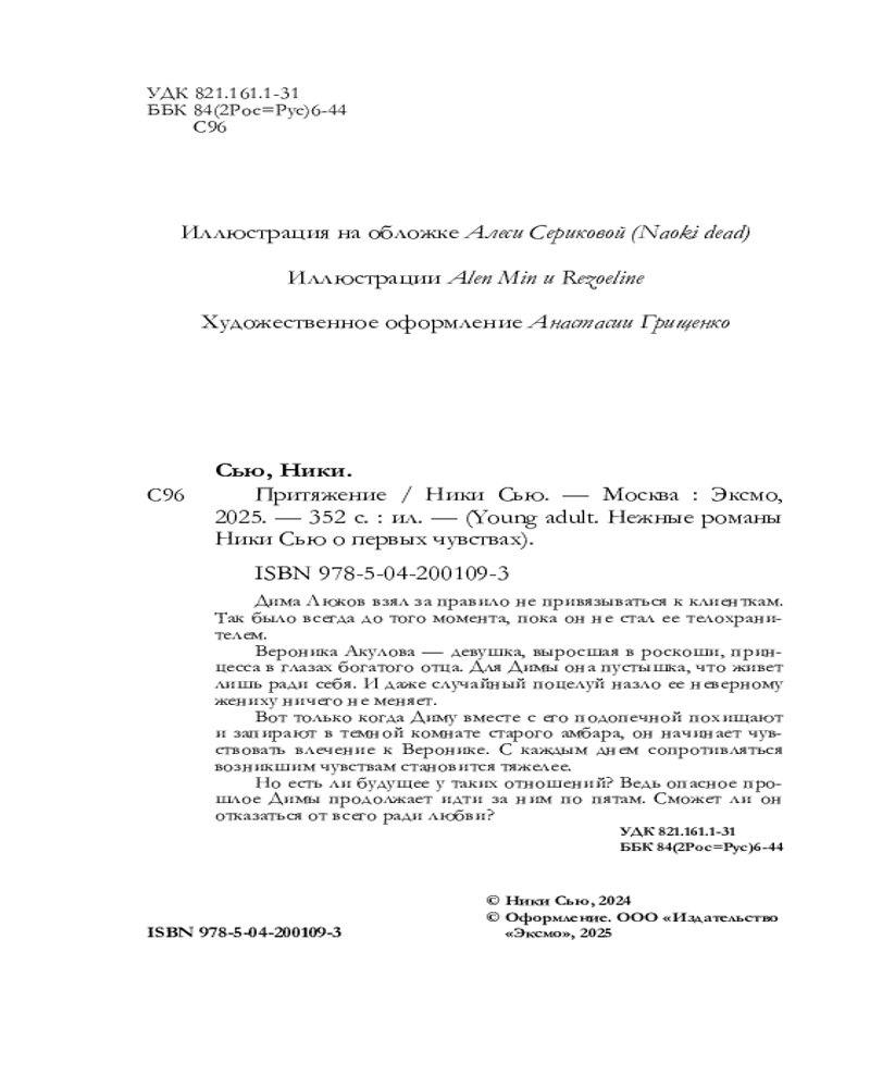 💳 Оплатить за товар можно при получении 🇰🇿 Есть бесплатная доставка по Казахстану от 1 дня 🎁 Копите бонусы с каждой покупки Серия: Young adult. Нежные романы Ники Сью о первых чувствах Новинка Ники Сью для всех, кто мечтал узнать больше о второстепенном персонаже романа «Пепел» — Диме Люкове. Вас ждет история запретной любви телохранителя к своей подопечной. Более 240 тысяч прочтений на портале Литнет! |
