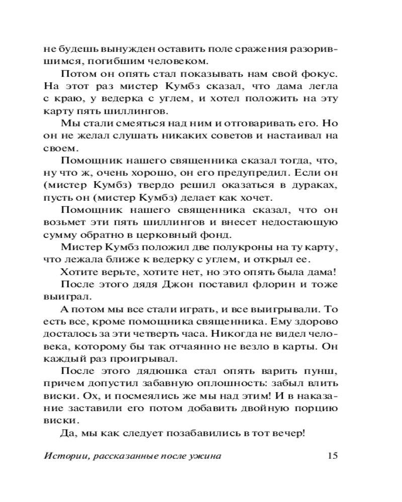 💳 Оплатить за товар можно при получении 🇰🇿 Есть бесплатная доставка по Казахстану от 1 дня 🎁 Копите бонусы с каждой покупки Серия: Эксклюзивная классика Устраивайтесь поудобнее, дорогие читатели! Вы услышите истории о несчастном призраке покойного Джонсона, что часами рыдает и завывает, мешая спать и играть в карты; о духе старого скряги мельника, что, наконец, решил рассказать, куда спрятал клад; и о загадочном привидении, что якобы обитает в голубой комнате. А еще — рассказы о большом черном коте, чье появление меняет жизни встретившихся ему людей; об обычном жителе Лондона, который лег спать и проснулся через тысячу лет; и о штатном авторе популярного журнала, решившем впасть в уныние ради написания трогательной статьи к Рождеству... |