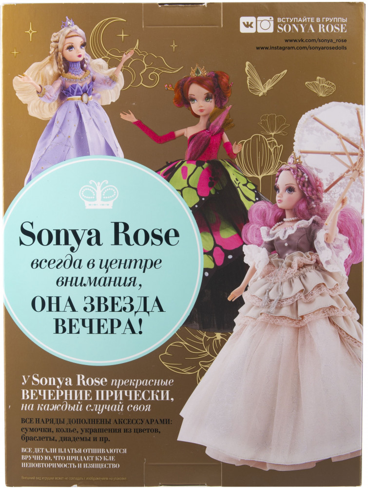 Sonya Rose Кукла «Фея цветов»В данный момент этот товар отсутствует в продаже. Возможно, у нас найдется аналогичный или похожий товар здесь. Серия: Gold collection Наряд куклы Sonya Rose Фея цветов как будто соткан из цветов. И юбка, и лиф состоят из длинных переливающихся нежно-голубых лепестков. Низ юбки украшен длинной золотой бахромой. У платья модные в этом сезоне пышные рукава-фонарики. Верхний слой юбки мерцает серебряными и золотыми звездами, золотой пояс украшает "лунный" камень. Звезды и полумесяцы украшают её волосы. На голове у Сони корона, а шею украшает голубой чокер. На ее ножках белые колготки в сеточку и босоножки золотого цвета. В наборе: кукла Sonya Rose с полностью шарнирным телом (8 шарниров), настоящими шёлковыми ресницами, густыми волосами, в съемной одежде и обуви. Высота куклы 28 см. Кукла Sonya Rose рекомендована девочкам от 3-х лет. Кукла упакована в красивую подарочную упаковку размерами 16,5 х 6 х 33,5 см Куклы серии бренда «Sonya Rose» выполнены из безопасного пластика. Все изделия сертифицированы и абсолютно безопасны для детей. Подставка не входит в комплект. |