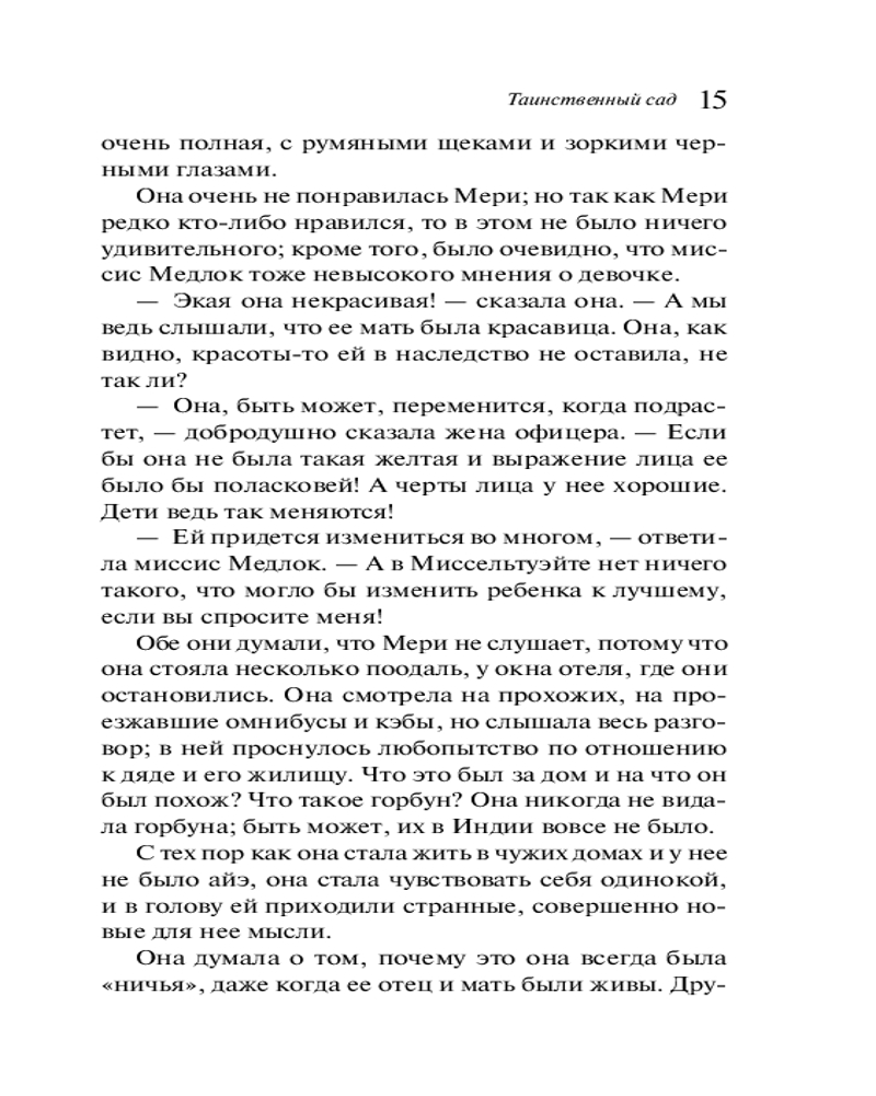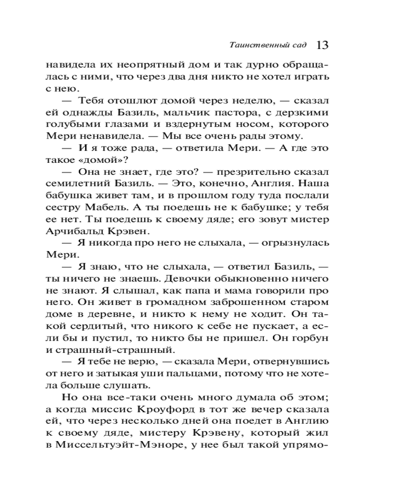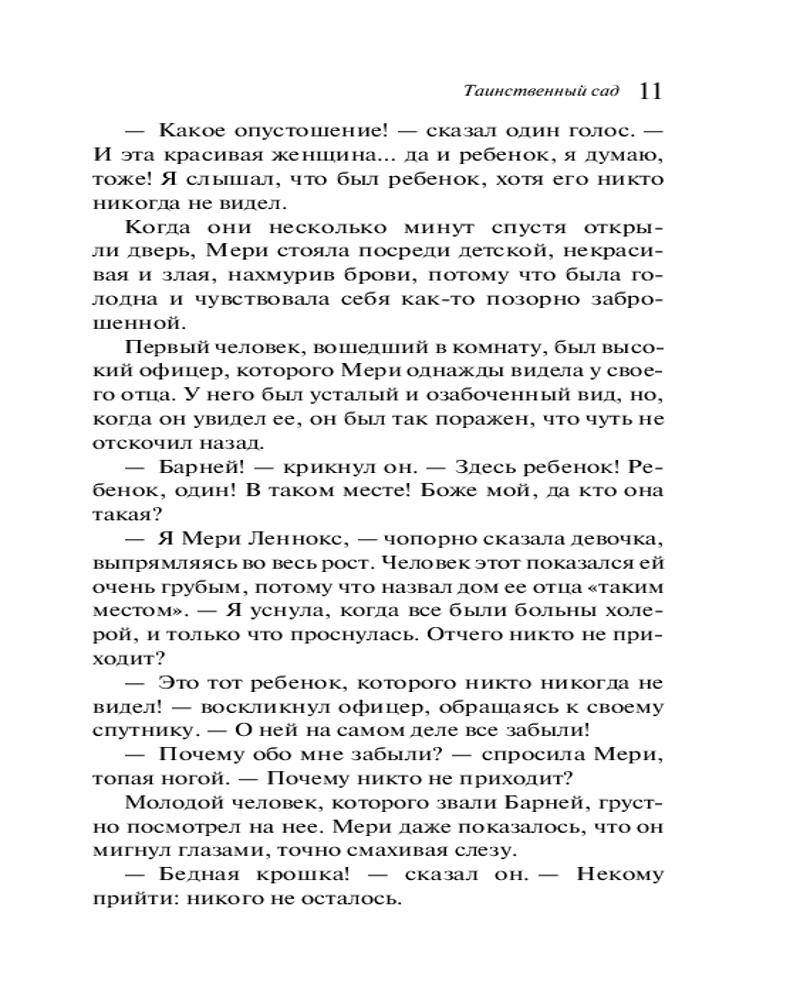 Таинственный садВ данный момент этот товар отсутствует в продаже. Возможно, у нас найдется аналогичный или похожий товар здесь. Серия: Магистраль. Коллекция Внезапно осиротевшей Мэри приходится привыкать к новой жизни. Ее отправляют в Англию, к дяде, дом которого скрывает много тайн. Невзрачную и хмурую девочку никто не любит. Ей очень одиноко. Она узнает, что в старинном поместье есть сад, куда запрещено входить. Мэри постоянно нарушает правила, а место, окруженное загадками, особенно притягивает ее. Она решает разгадать секрет Таинственного сада. Однажды она находит потайную дверь в удивительный мир и с этого момента начинает верить в волшебство. |