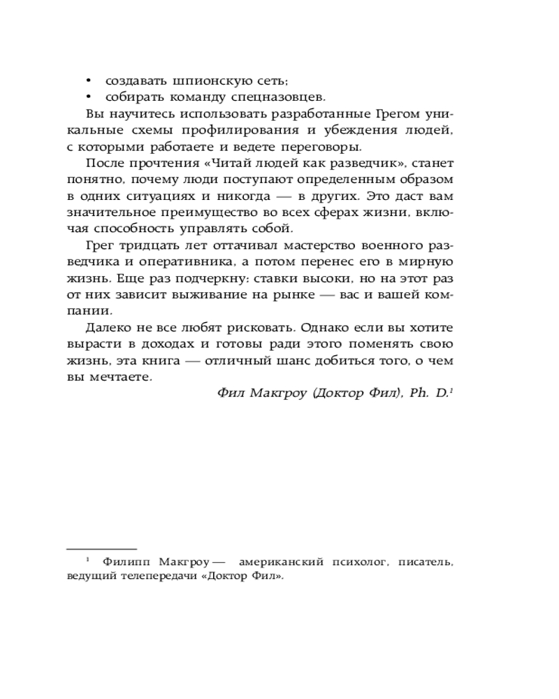 💳 Оплатить за товар можно при получении 🇰🇿 Есть бесплатная доставка по Казахстану от 1 дня 🎁 Копите бонусы с каждой покупки Серия: Влияй и убеждай. Книги, которые помогут добиться своего Автор этой книги, Грегори Хартли, — эксперт по допросам в военной разведке США. Более тридцати лет он вычислял злоумышленников и предотвращал теракты. А затем, покинув госслужбу, адаптировал полученные навыки к реалиям гражданской жизни. Эта книга — системное руководство по применению инструментов военной разведки в бизнесе и не только. Она объясняет, как распознавать угрозу в своем окружении, видеть насквозь потенциальных партнеров и клиентов, быть максимально убедительным на любых переговорах и всегда оставаться на шаг впереди своих конкурентов. Книга будет полезна собственникам бизнеса и наемным менеджерам, а также всем, кто хочет выходить победителем из любой ситуации. |