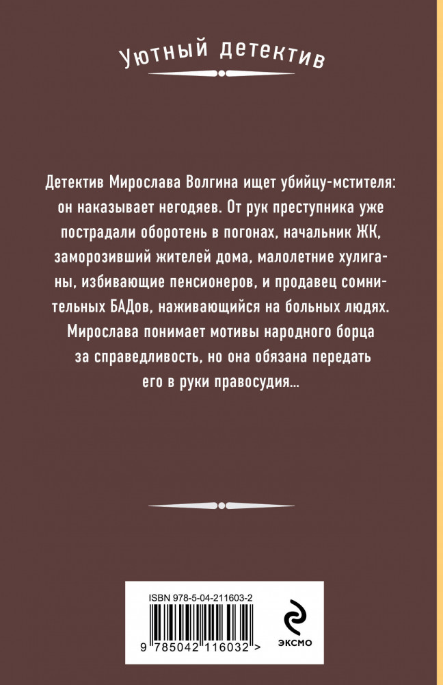 💳 Оплатить за товар можно при получении 🇰🇿 Есть бесплатная доставка по Казахстану от 1 дня 🎁 Копите бонусы с каждой покупки Серия: Уютный детектив (обложка) Детектив Мирослава Волгина ищет убийцу-мстителя: он наказывает негодяев. От рук преступника уже пострадали оборотень в погонах, начальник ЖК, заморозивший жителей дома, малолетние хулиганы, избивающие пенсионеров, и продавец сомнительных БАДов, наживающийся на больных людях. Мирослава понимает мотивы народного борца за справедливость, но она обязана передать его в руки правосудия... |